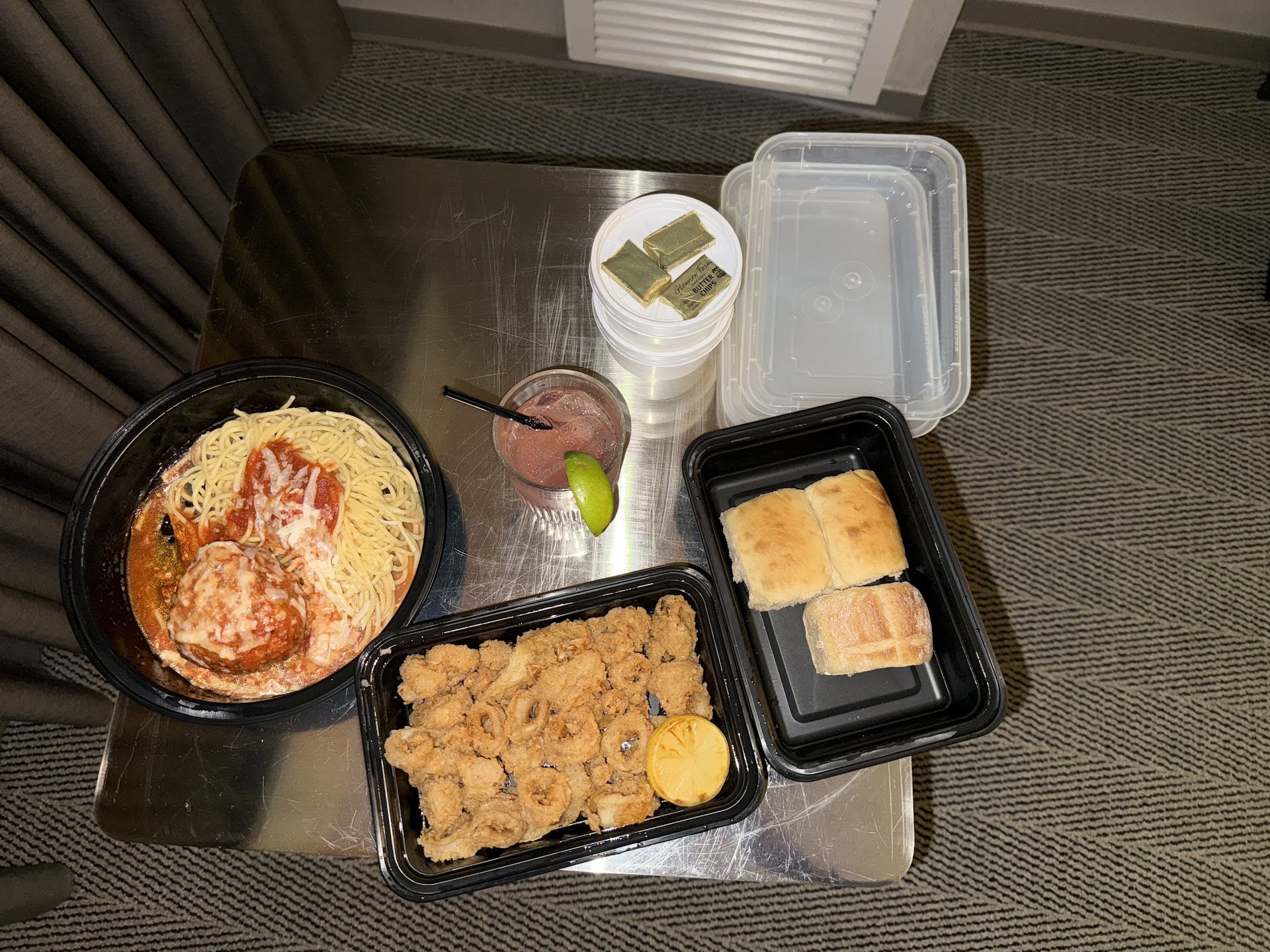 Read moreStayed at the property as a guest this week. I have been to this property for a few times and this is my second time trying and their restaurant. This time I tried the spaghetti and meatballs with a side of Calamari. To begin, I made the order at the restaurant and was told it would be ready in 20 minutes. I went upstairs to put my belongings down, used the restroom and came back to pick up my order. I stood waiting for my order at the front and they gave me the drink. I ordered while I waited my food. I then proceeded to wait another 20 minutes for my food while my beverage became water down. I asked to add bread to my order In which the host was happy to do. When my order then came out, I requested Parmesan cheese and butter. The whole went to the back to get it. I’m proceeded to take another 10 minutes to bring it out. When she came out, she had the butter and a Parmesan cheese and a Coca-Cola half a drink in her hand. I would appreciate better service, more attentiveness to guess timing, and more accuracy in terms of order production. The calamari is my favorite; it was splendid, just as the first time I had it. Unfortunately, the spaghetti and meatballs were watery. The meatball was too big; they should consider making them smaller. Lastly, the pomegranate mule drink is one of a kind...