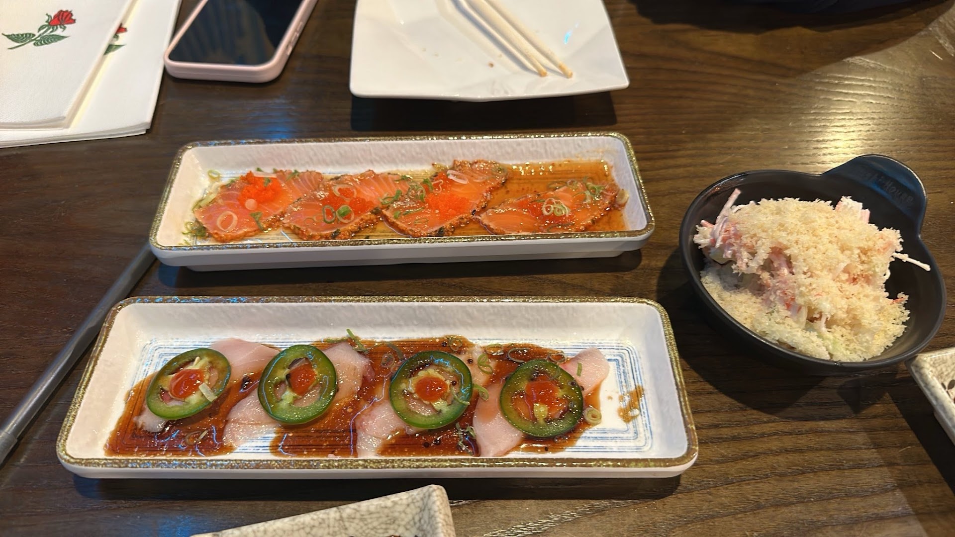 Came in with my hubby on Memorial Day at around 1:30 and it wasn't too packed. Everyone was socially distanced - I thought it was cute that they put a parasol on top of the tables where people weren't allowed to sit at. We were sat at a cozy booth (although at times, too cozy because we had to make a couple of requests multiple times). There was no lunch pricing that day, probably since it was a holiday, but we wanted sashimi anyway (which isn't typically included on lunch menus for AYCE anyway)