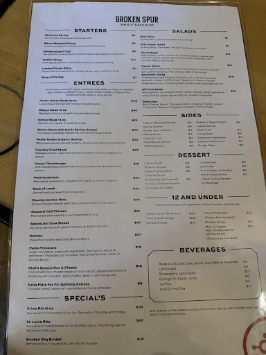 We had a great experience at the Broken Spur Steakhouse! The loaded potato skins were the perfect way to start—crispy on the outside and loaded (literally) with melty cheese, bacon, sour cream, and chives. So good.