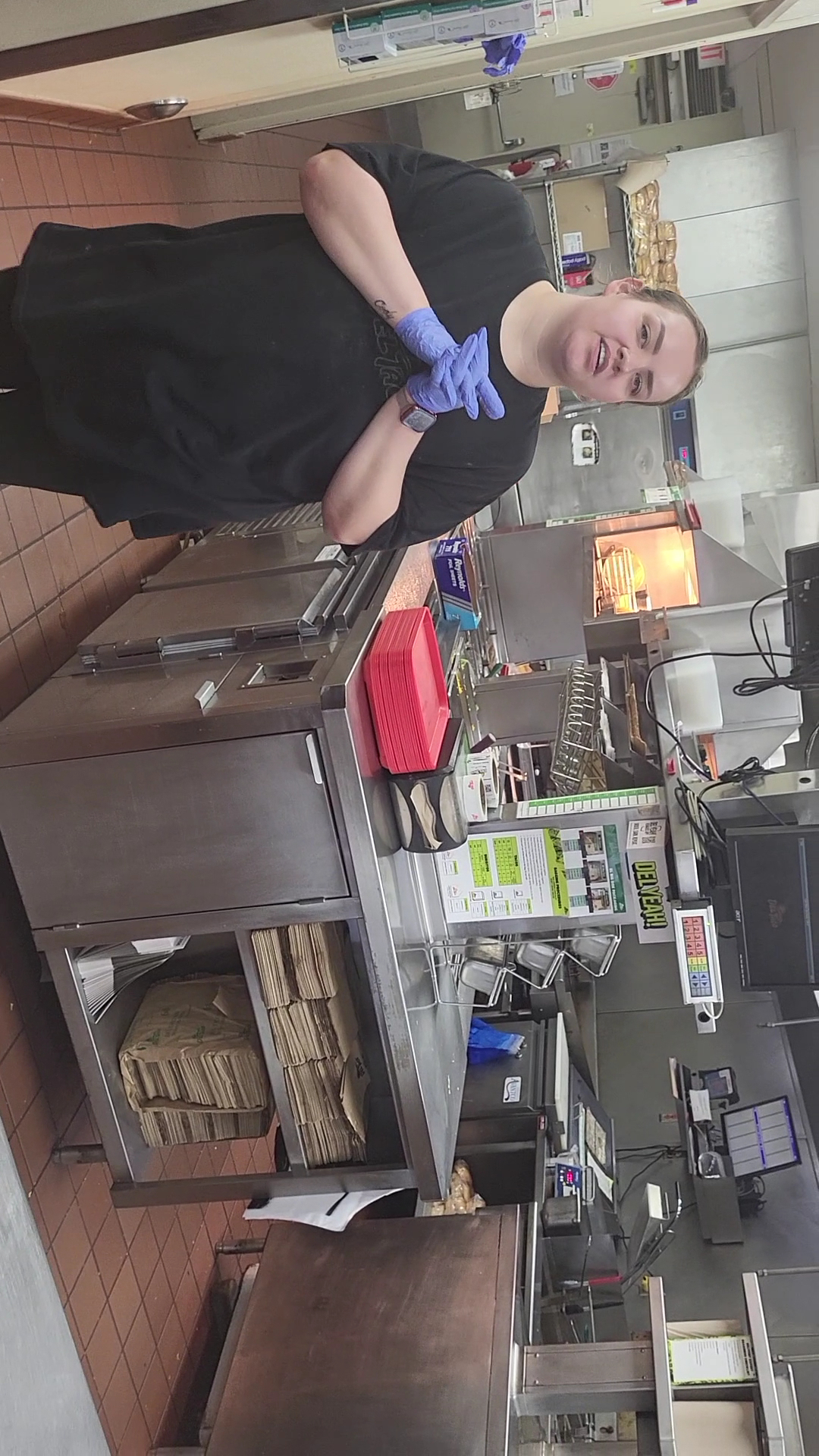 There were four employees behind the counter: 1 manager, 1 line guy, 1 drive-thru gal, and 1 other gal standing around eating.