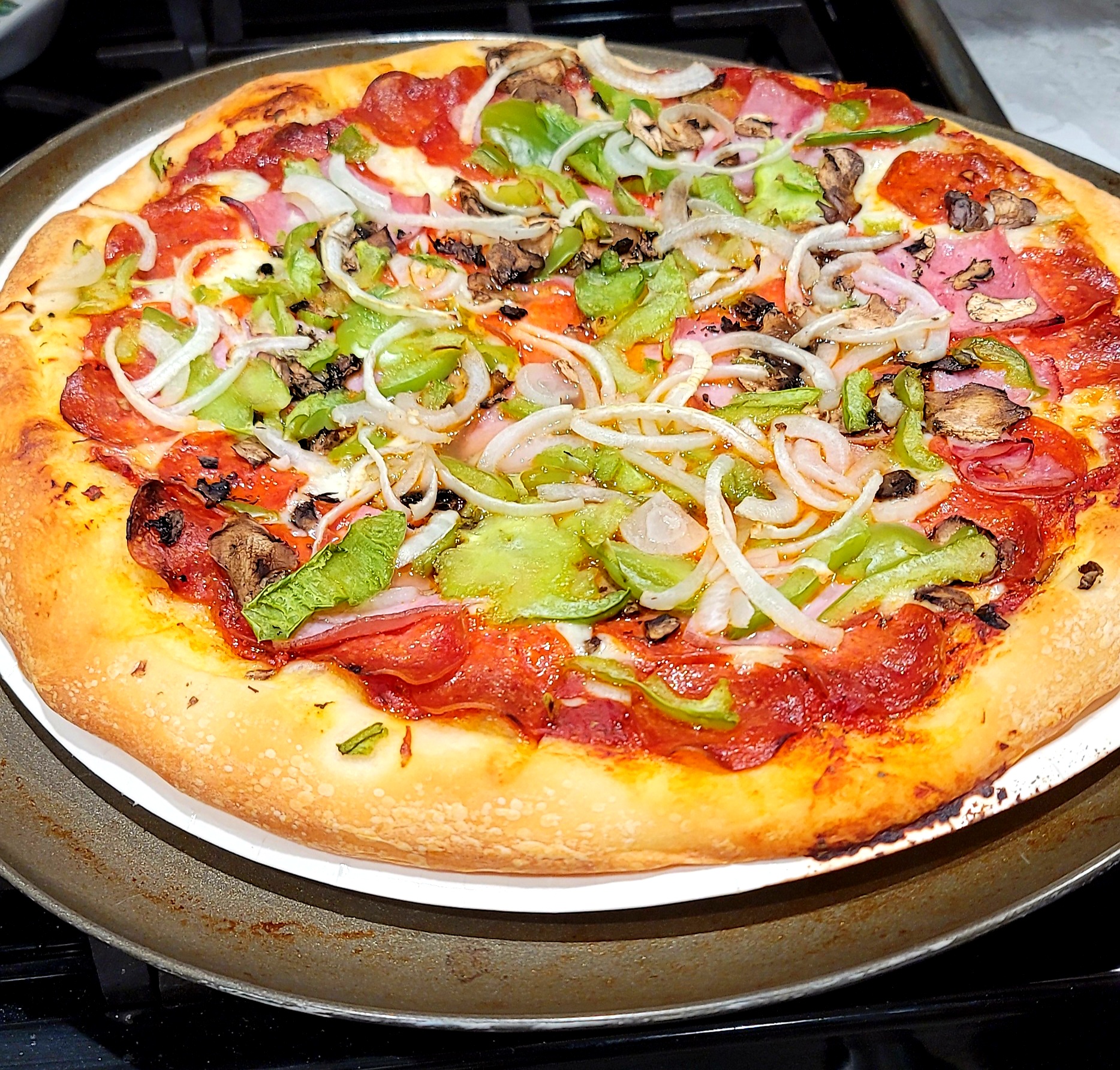Now, do yourself a favor. Ask for parchment along with the paper pan. Also, get yourself a 16 inch pizza pan at Walmart to pick it up, but bake them in the paper pan as suggested. You do not want to pick up an extra large with no pan, trust me. Follow the directions they offer you for baking, but watch the baking progress the first few times. Each oven bakes in a little different length of time.