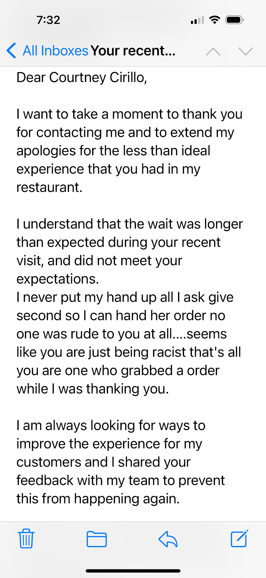 Read moreUpdate, managers response is in the photo. She called me a racist… how she came to that conclusion, I have no idea.