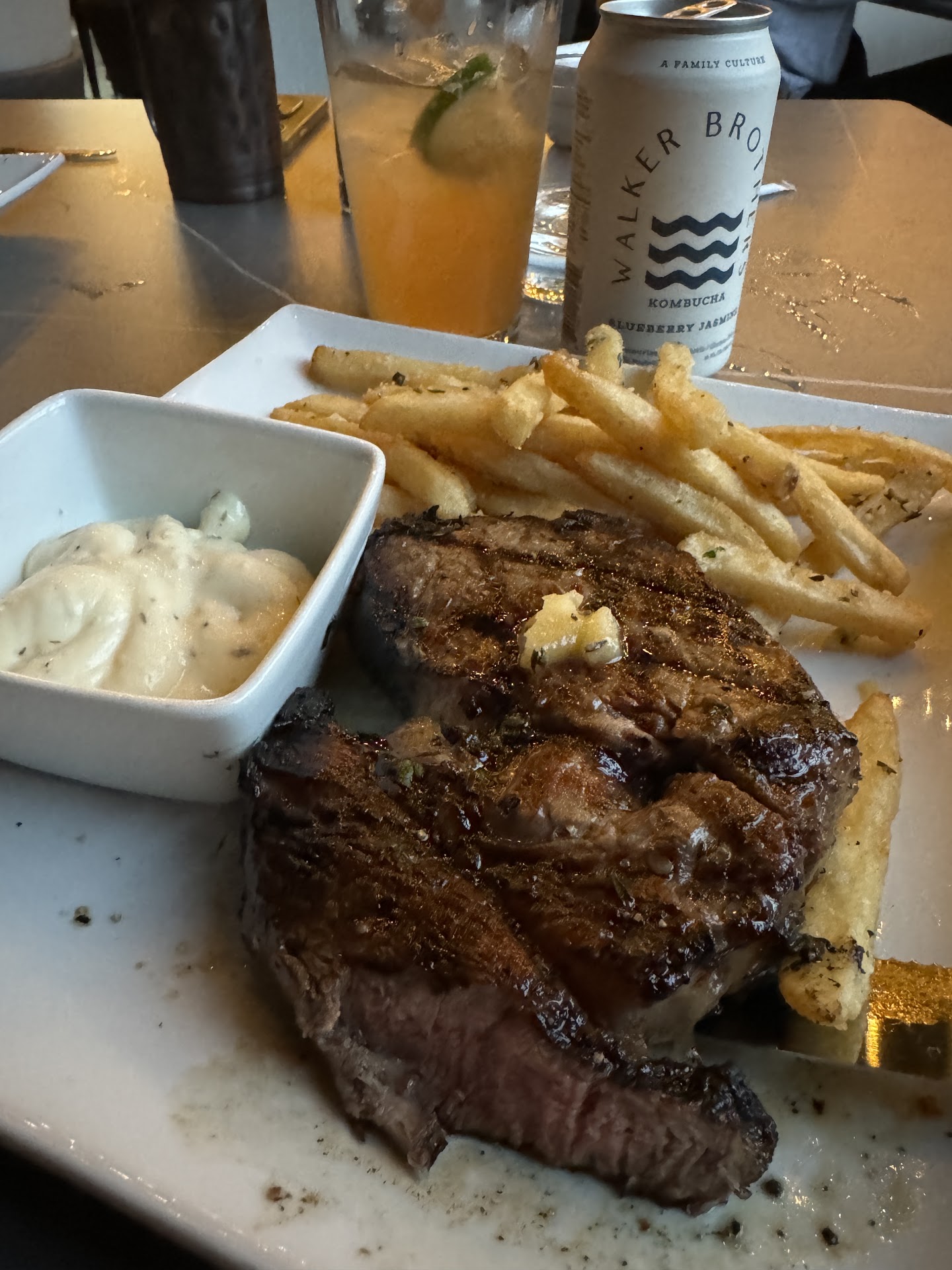 My husband and I brought my father here hoping for a good meal. We had heard it was alittle pricey so we were expecting higher standards. This was our first time and walking up on the side where we parked it was unclear where to enter to begin with. We lakes up where the tables were and 2 girls standing there just stared at us not once greeting us ur tell us where to enter. When seating us we told her we wanted 3 teas her reply was I’m not your waitress. The proper response should have been thank you then go tell our server our drink order. When our server came to get our food order I asked if bread was served with the meal , we were told yes and it would be a shared plate. Guess what … No bread with a very $$$$ meal and only one side, bread is extra . That’s right, you order the ribeye it only comes with 1 side no bread not even a cracker. Now for the food . We ordered 2 ribeyes med rare , one was made to order and the other was med well.. I have to commend the mgr. she approached us giving half off the over cooked one and was going to give us an order of bread on the house. But after eating our meal and waiting 30 min and at this time never getting a bill my husband had to approach our server who was obviously ignoring us for the bill and he said to just forget the bread. And to top it all off not once was our glasses refilled. I know y’all are new but you need to train your...