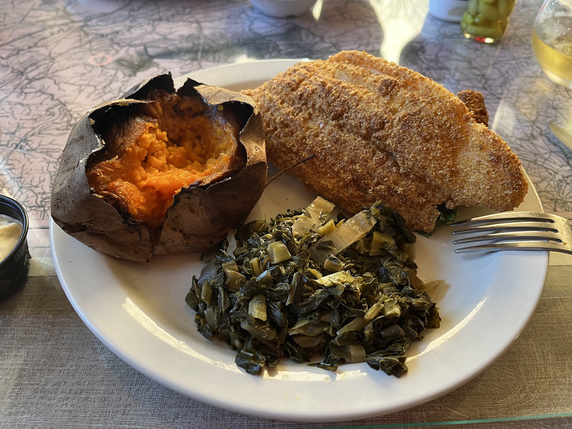 My usual go-to for southern, diner fare is fried catfish (cornmeal only. Save the batter), a sweet potato and greens. The catfish was fried crispy and chewy, my fav, and the sweet potato was everything one should be- over baked, sweet and fleshy, with the skin a little charred. The greens at diners are hit and miss and unfortunately they are a miss here. Iām 98.7% sure theyāre canned. Fresh only for me, so Iāll mark this one off my list. Everything else was superb. My husband got the all you can eat fried fish with hushpuppies, fries, and coleslaw. The fish was battered and covered with (I think, Ritz crackers) and fried to a crispy yum. The fries weāre also delicious, crispy, and lightly seasoned. The coleslaw was another miss. It lacked flavor, and the substance was that you could spoon out with an ice cream scoop and it would keep its shape. The all you can eat comes with dessert as well (apple cobbler on this visit) which was very good and, so weāre told, made in-house. They have an impressive selection of house made desserts also. Anytime you can find a diner that serves homemade coconut and peanut butter pies and carrot cake, is an automatic winner to me. This little cafe is a local gem, with great food, and extremely friendly service, amidst a beautiful backdrop of Tellico Plains. We will be back and you know that I am going for the...