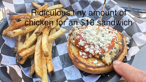 I ordered the buffalo chicken sandwich. A ridiculously tiny piece of chicken was on my sandwich. I had to stand up for myself and insist I get a proper serving of chicken for an $18 sandwich. I was left with nothing but fries to eat while the rest of my party was eating. Somewhere between the Koch, the restaurant manager, and the server somebody shouldâve caught this mistake and not try to hoodwink me. The chicken was cooked perfectly, the buffalo sauce was squirted on top. This is not the proper way to prepare and serve buffalo chicken - it should be marinated and cooked in its sauce so the flavors are infused. Very limited draft beer menu, and the beer was not super cold or super fizzy. Finally, it took two bottles of water to get over the amount of salt that was in my meal and I was left with a gut bomb the rest of the day. Needless to say, I will not be returning to...