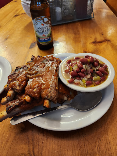 As I said the food was good. I got a half rack of ribs and a side of red beans and rice. For dessert, a slice of pecan pie. The ribs could have used a rub prior to being cooked and sauced, I think the rub would have added a bit of missing spice that the sauce didn't have. I did like the hearty pieces of peppers and onions in the sauce, though. Red beans and rice, again, need some seasoning. This is supposed to be a southern-inspired restaurant. The hot sauce on the table added what the red beans and rice were lacking. The pecan pie was properly warmed in an oven (evident by some slight crust blackening), served with a scoop of vanilla ice cream. It was a good finish to the meal.