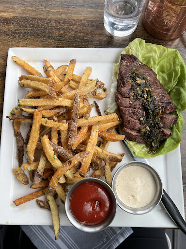 I asked to sit at the bar and I ordered the burger with bacon and blue cheese (a beerdrinkers best friend) and it came out delicious. Lightly toasted bun, thick and crisp bacon, juicy burger, with the wet parts on the side (which my pet peeve of soggy bread really appreciated!) I got the caesar salad instead of the fries and there wasn't freshly crushed pepper but there was the nice pieces of parmesan that make the caesar salad tasty.
