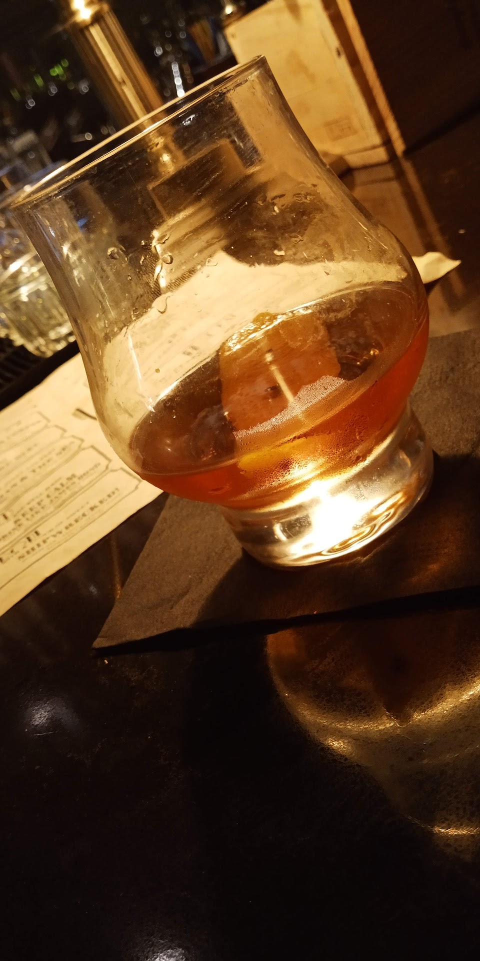 On to the drinks! Kassidy was mixing at the bar. Although our server Ryan seemed rushed, he did give some whiskey guidance and we ordered a whiskey tasting to start. Smoked old-fashioneds were out as we were told their “smoker was broken”. I ordered an Aviation, which should be a gorgeous pale purple from the crème de violette. Instead, mine was served barely cold, with no garnish, and green in color! It was clearly not an Aviation, which would have been fine had it been more chilled. And please, you’re a speakeasy – all cocktails should be garnished! We probably would have ordered some small bites, but Ryan was quite busy and never asked. With wait times for the whiskey tasting and our drinks, there was no time for food or another round. Last call came at 8:10 for their 9pm close.