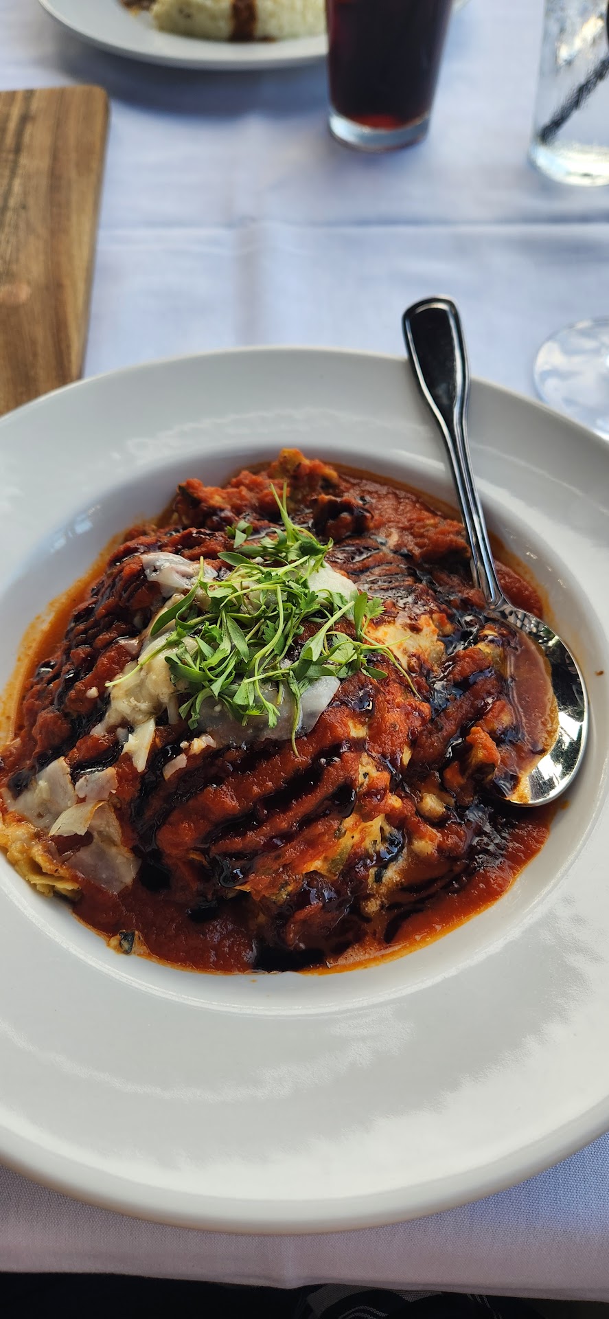 Our table was in the outdoor/indoor area, which has plenty of heaters. The restaurant is a modern, very open outdoor atmosphere. They have a few cabanas with fire pits as well. Our waiter, Antonio, was great. Very friendly, and he was able to answer our questions about several dishes, offering his opinion when asked. I had the Chicken Schnitzel and it was geshmak! Presented beautifully, cooked perfectly, and super delicious. I also added the shrimp at Antonio's suggestion, but would pass on that next time, as the shrimp was a bit overcooked. I didn't end up eating all of them because of that.