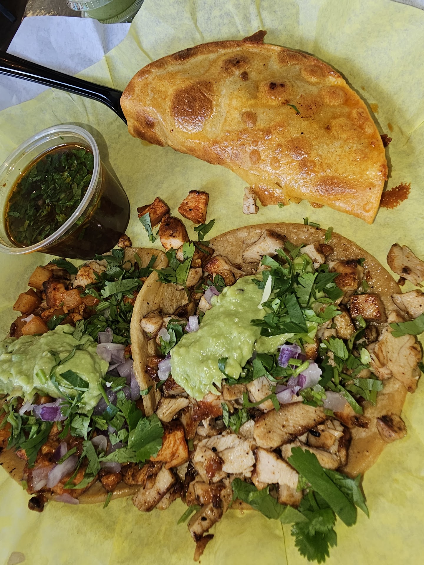 Next, we enjoyed the hand-rolled tacos, which were delicious. We opted for a mix of shredded beef and shredded chicken, both of which were fantastic! They came with fresh guacamole and sour cream, making the meal even more indulgent.