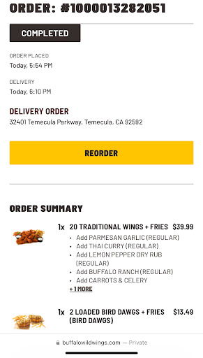 Read moreTried the Temecula location for the first time tonight. The pick up process was very unorganized. Just kinda had a bunch of people all piled on the small sidewalk waiting (with no social distancing). They had little signs but no one seemed to be following them. I feel like instead of having Doordash pick up, normal pick up, pay, they should have one line for all of them and at the end of the bar have the food pick up. That way not everyone is standing in front of the bar waiting for their orders. We ended up staying an extra 20 minutes after our supposed pick up time. As for the food, the traditional wings were pretty good. Although the sauces weren't actually on the wings, I don't know if this is normal for take out. The fries were overcooked and the oil definitely needed to be changed. My bag smelled of burned food, can't place what was burned though. The carrots were dry and had a weird texture. The sauces/dry rubs were pretty average.