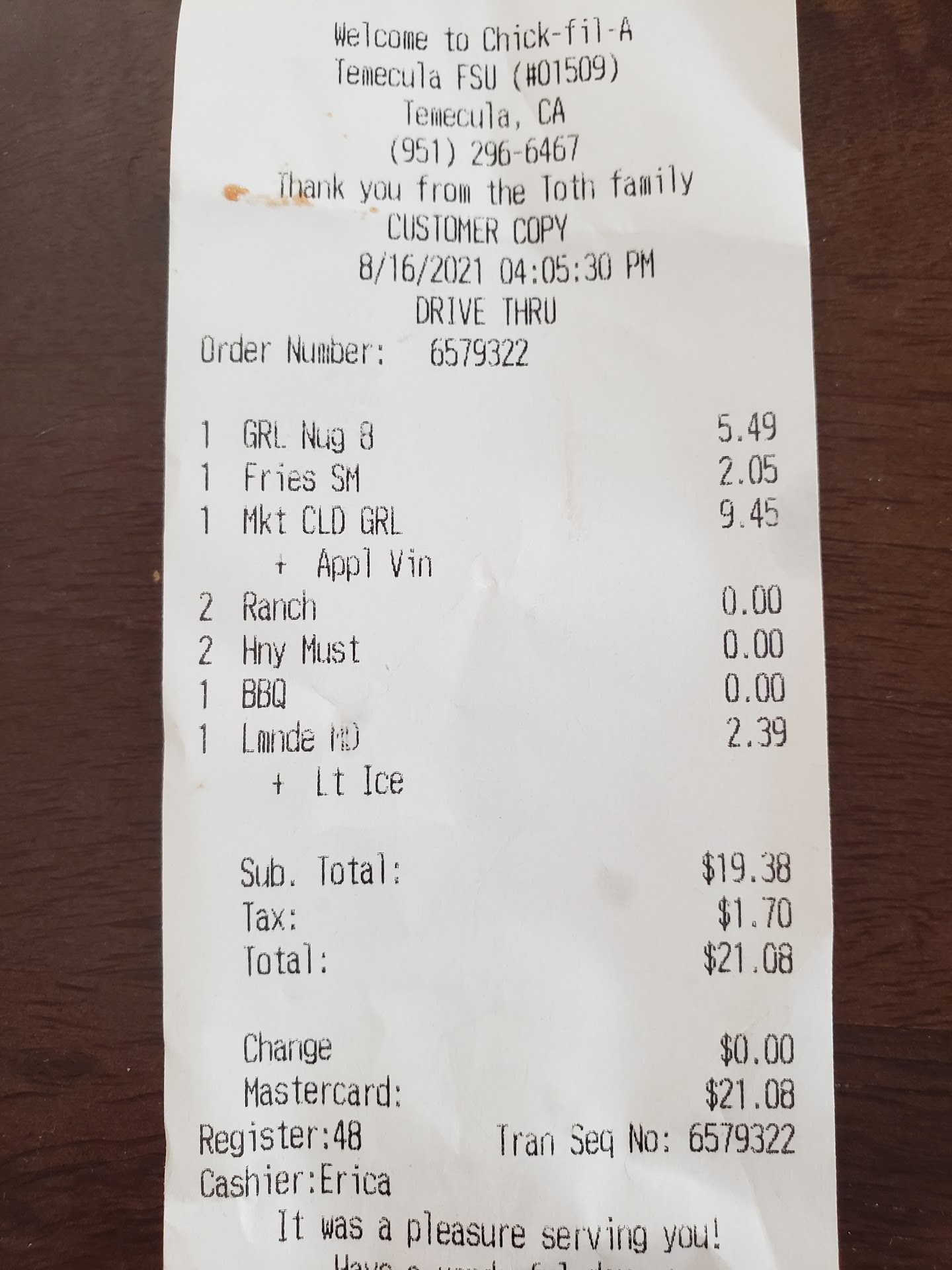 Read moreI came to this Chick-Fil-A location with my niece around 9pm. One of the staff employees, James, was outside taking customer orders. He did exceptionally well when taking my order. I was ordering for 4 so it can be considered a long order. When I asked for a discount, without hesitation, James got in touch with his mangers. I wasn’t expecting to get a discount, but he followed proper protocol and quickly got his staff too verify if I was eligible. Kindly after return, James and his manger came to my car and let me know that I couldn’t receive said discount. I was completely okay with this information. Throughout the whole ordering process he and the Chick-fil-A staff were extremely friendly and accommodating. You can tell that James is an employee that takes pride in his job and has a strong work ethic too. Full disclosure, I have never personally met James or any coworkers of this facility. I live in San Diego and come to visit my family that lives around this location. I have a keen eye for detail and pay attention to things people usually tend to ignore. Food overall was great, per usual. I just wanted to write this review to express how impressed I was by Jame’s work ethic. I am kindly requesting that you give him a raise or a promotion. Jame’s work efforts should be recognized and rewarded as he created a friendly yet professional...