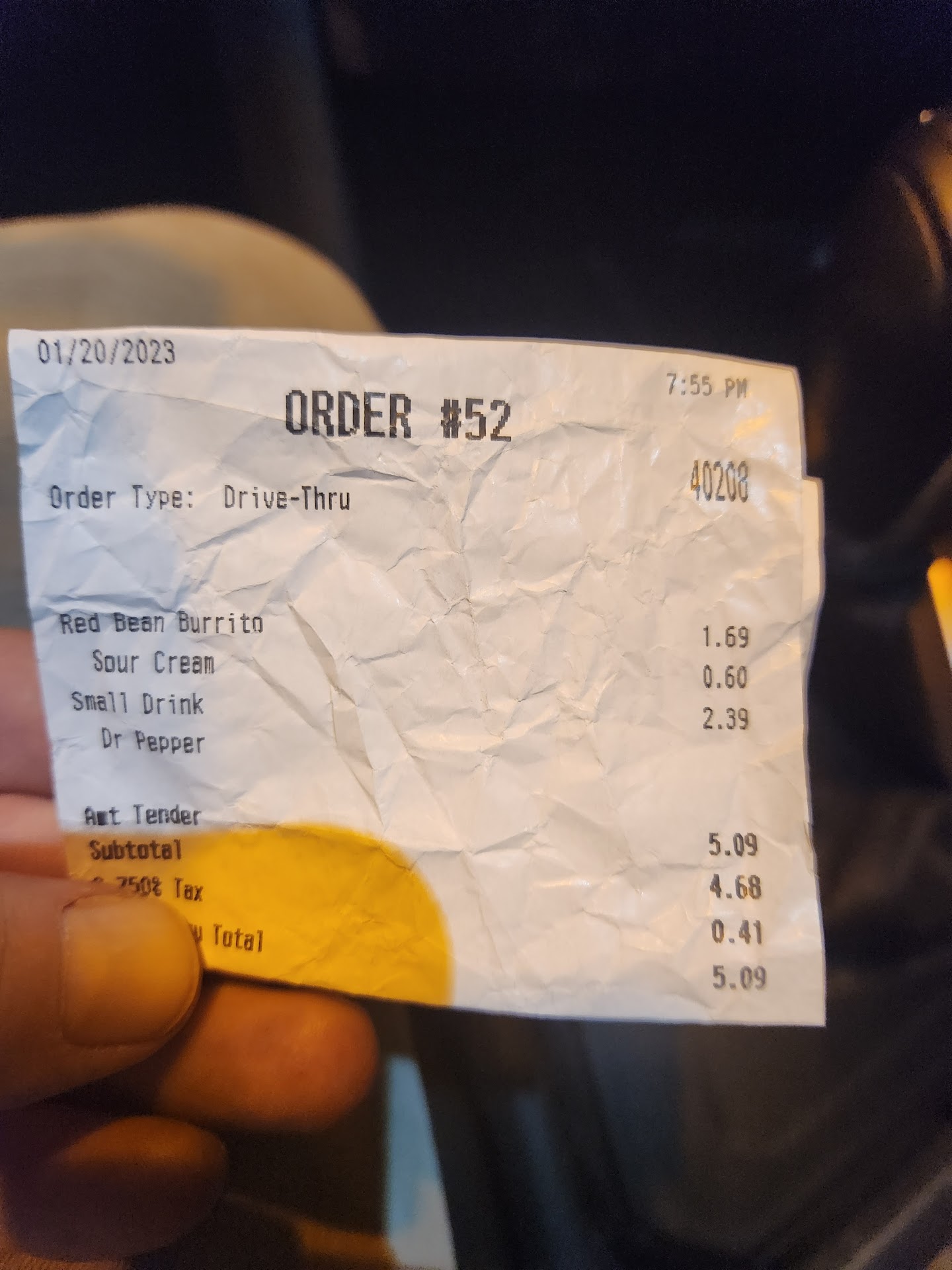 Read moreI ordered 4 Del Tacos, and what I received for my money was an insult to me personally, as well as an insult to their corporate image as a desirable fast food restaurant chain. There is a picture below of what the Del Taco website promotes of what their Del Taco should look like. I have also posted the empty sorry excuse of a "Taco" they gave me. This was a drive through order, so they knew it would be difficult to check tacos without making a mess. This is not the first time this type of extreme skimping has happened. It seems to occur in about 1/3 of the orders placed here. I am always respectful and polite when ordering, so this wasn't retribution for my rudeness. This is either a case of bad management encouraging extreme portion controls to make themselves look good to corporate, or an incompetent careless employee that doesn't care about doing a good job. You would think that for $20 per hour they could find someone that would know how to make a Taco that looks like their own picture example! I used to enjoy the food here, I hope they can find a cure for this ongoing problem before they loose all...