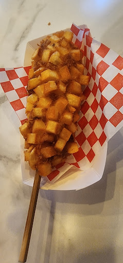 I was really hoping for an outstanding experience, instead I received a not so pleasant visit food wise. The regular potato corn dog #4 & the half/half #5 were my choices today. Both selections were similar in taste. The half & half on the other hand could go either way. Disappointed that the cheese came right out leaving a void before the dog part came into play.