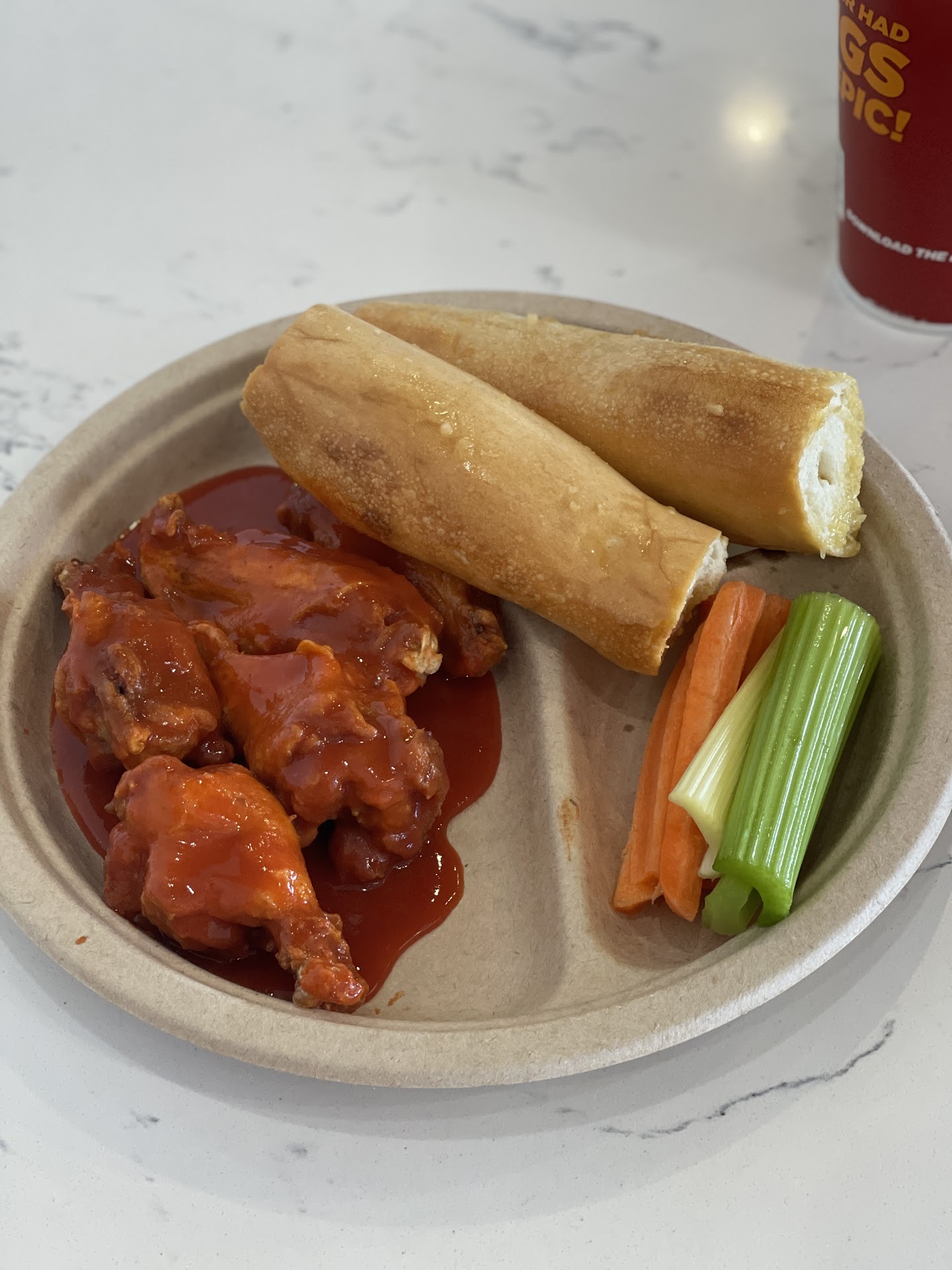 So, it comes with bread sticks. How these were undercooked and 'doughy' tasting and the fingers were overcooked, I have no idea because the breadsticks are the one thing you CAN hold in a warmer and hold for service for over an hour. And, if they know what they are doing, they could have one proofer and one warmer. That way they could potentially always have fresh ones all day long. Breadsticks are not high food costs so even if a few are wasted, it's not a big deal. When the place is one main item with just various sauces, you want to focus on making sure that singular item is on point ESPECIALLY if its double the price of chain stores within a couple minute drive.