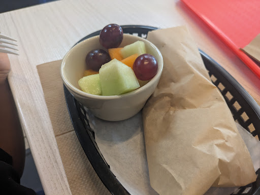 My little one got the kid's meal with bean burrito and fruit. We asked to omit the cashew cheese. The fruit was melon and grapes. The burrito was made with pinto beans and grilled and delicious