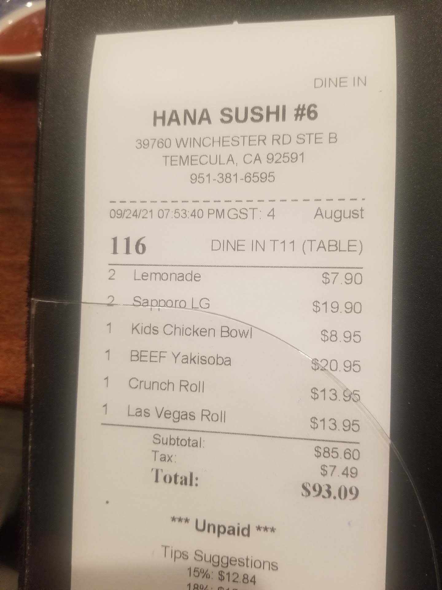 Read moreHoly moly what can I say about this place that gives it justice? The fish is the absolute freshest, best tasting in Socal by far! The staff is incredible and knowledgeable, super friendly and accommodating. We eat at this Hana about once a week to every other week and have never been disappointed. They are very consistent with quality and taste, it's always the best. Enough with complements let's get to the food, the sushimi is cut to perfection and the freshest best quality around. They have sushi type salads that are fantastic. The rolls we get are the Amber, Michelle, Viking, Scotty's and a few others. They have garlic edimame that is bomb! We have have had the salmon and spicy pork boxes and the portions are great. The only downside I can think of is that sometimes they close for the night and make us leave. If you don't know what to get, ask, they will guide you to perfect choices. Speaking of that I have to get my...