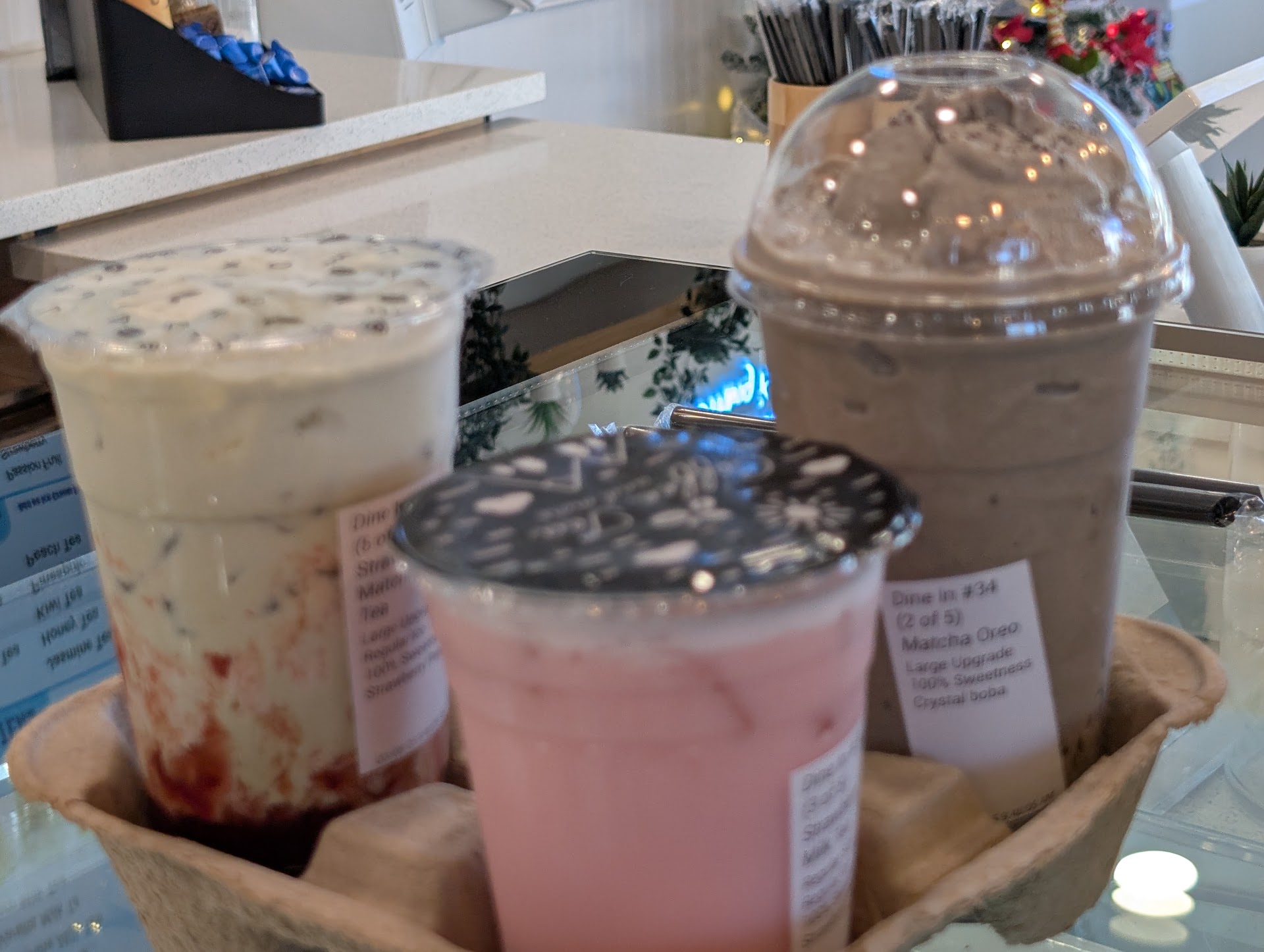 The women running the shop were so sweet. They were so professional and helped us get the best order possible. They made sure we knew what everything was and we had a nice conversation while waiting for our drinks (which didnt take very long, it was actually shorter than my average Starbucks expirience). She explained how all the teas were hand steeped and the black boba was homemade. This experience was one of the best ones I have ever had at a tea shop. I highly reccomend you go to this shop, also the location was very aesthetic, and made me feel so comfortable. I also recommend that you get the hawain sunset with black boba, strawberry boba,...