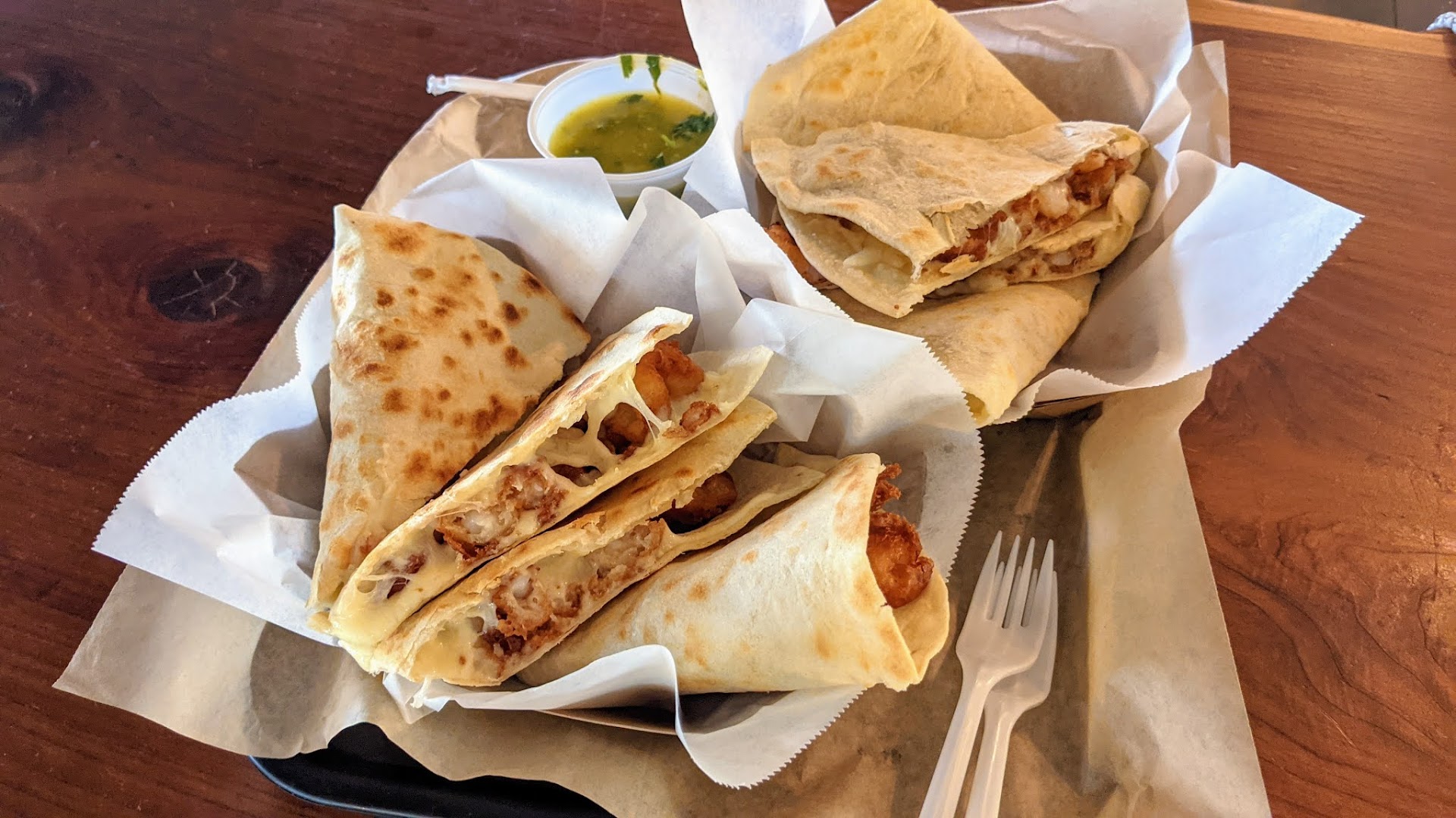 My wife and I stumbled upon this place when we were actually considering another place close by in the Vail historic center, located in the Redhawk Shopping Center --- and are we glad we did! I should start by saying this place does not have a website (they need to get one), and it is located in what I would term a mini-food court, but that is really doing it an injustice. There are 4 eateries and they share a common indoor and outdoor eating area (when it says that they are not open for dine-in, also misleading, as you do have these two areas to sit don and eat). My wife ordered the Catch of the Day fish taco, which happened to be Sea Bass, while I ordered the Shrimp Burrito with the Chipotle sour cream. We also ordered the Chips and Guacamole as a starter. The chips appear to be home made and are thin. However,, the guacamole was the star! It is plentiful, and chunky and they throw in a few diced tomatoes, onion, and I believe some type of chili pepper -- not spicy but tasty. It was, without question, the best guacamole I have ever had -- restaurant or home made! My only suggestion is that they also serve some salsa with the chips (they have a chips and salsa option, but it is separate from the chips and guac). On to the main attractions: Let's start with the portion size; my wife's taco was really nice sized and she said that they gave her enough fish to easily make 3 tacos out of. More importantly, she said it was delicious. My burrito was almost laughably huge (I could barely hold it together with both hands it was stuffed with so many delicious shrimp). But I wasn't laughing once I took a bite into it. It was more like I was creating a new language filled with "Mmmmm's" and "Oh my God's", and other mumbling superlatives that I could muster in between bites. And, just as with the guacamole, I think this might have been the best burrito I have ever had.