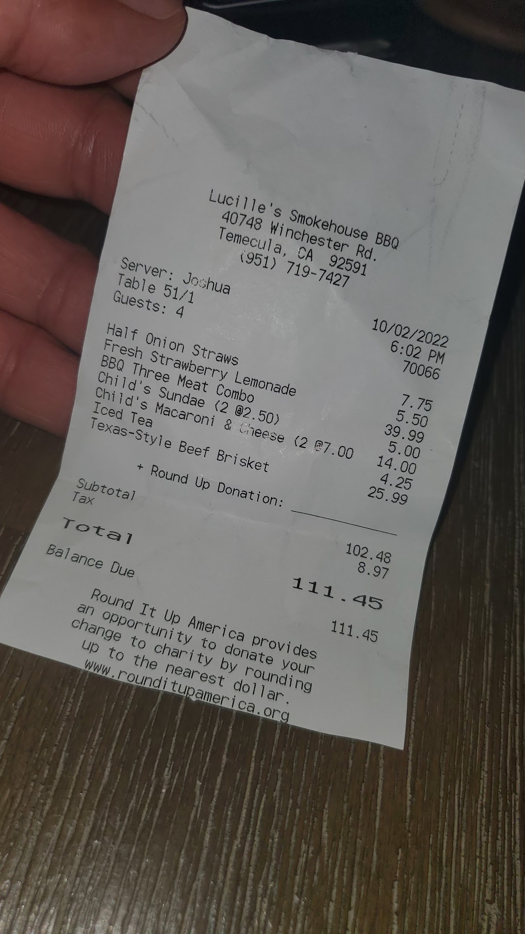 Read moreBeen a long while since last visit here at the temecula location. We usually go to the one at Victoria gardens. My family and I of 4 stopped in after a pop warner football game with no reservations and it was said 30 mins for a table so we sign in. Little did we know that it was 50 mins later till we got a table. Took another 20 mins for josh the waiter to tend to us. While we ordered our drinks we went ahead and place our dinner order as well. I ordered the 3 meat combo with baby back ribs, texas hot sausage, and beer baked chiken and onion straws for appetizers. My other half had the beef brisket combo dinner and for the little ones mac and cheese with fries along with some ice cream to keep them seated while we wait. Took another 20 mins for our drinks and bread to make it to the table and about 40 mins for our meal. By the time our dinner got to our table we were pretty much full from the appetizers (bread/butter and onion straws and drinks. Meal was good but coud have been great and we would have enjoyed it if had come in in a timely manner. Kids were tired and i was unhappy with the poor service. Josh our waiter was not very attentive and barely checked if everything was okay. We barely touch our meal and we were ready to travel back home to san diego. All and all, food was good and Lucille still a great place to dine in and still highly recommend it. I know it gets hectic in a popular stablishment as lucilles. Maybe we just had a waiter thats not having a good day. 3 star this time for poor service from the waiter. We will try again...