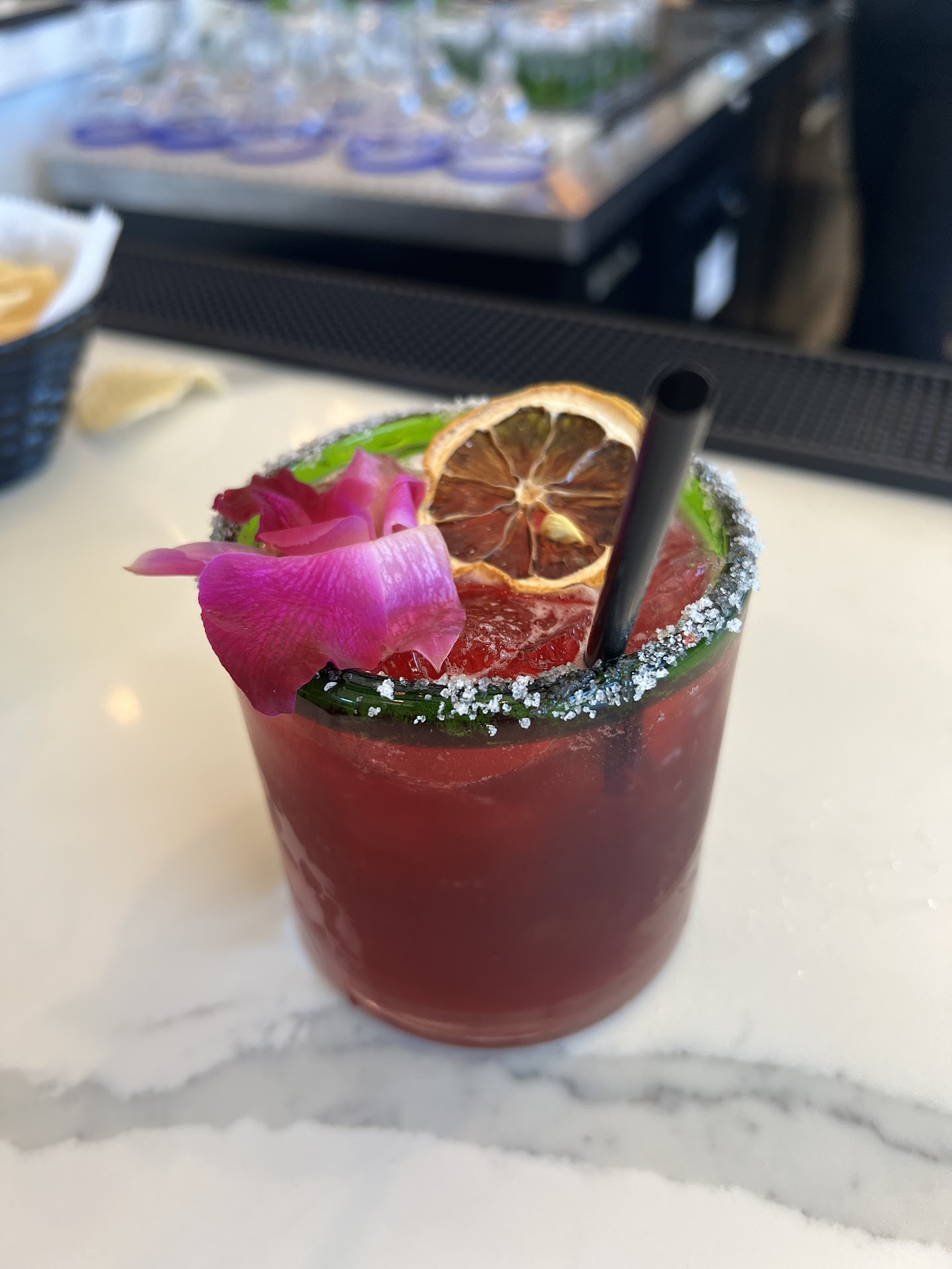 I noticed that it was taco Tuesday and several of us ordered their street tacos. I felt that the street tacos were excellent and contained ample protein. They had very good flavor and I was very pleased. My friends had other dishes and they were pleased with their dishes as well. I had a strawberry margarita that was very good and my husband had a mango margarita with tajin on the rim. My margarita came with sugar, but I opted to leave it off and they accommodated my request.