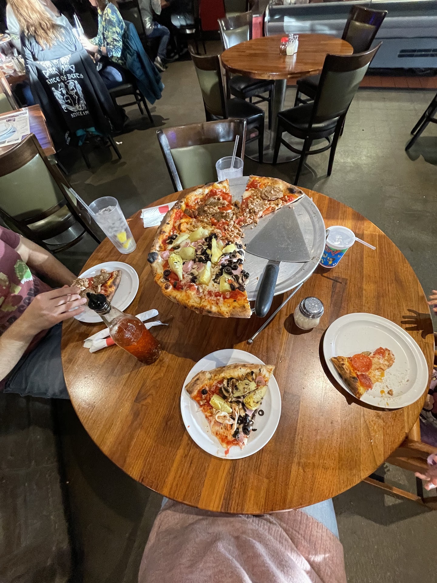When I asked for a young man from the bar for his opinion on the wine, he brought the bartender over. I then asked the bartender how he thinks Zinfandel should taste. He said spicy. I told him that despite him opening it up this morning, it clearly had no kick and felt watery. I then told him about the bland pepperoni and the luke warm pizza, and he then reached over in a hurry, grabbing my plates and glass, and walking off to set the glass at the bar counter and take the pizza plates back to the pizzeria side.