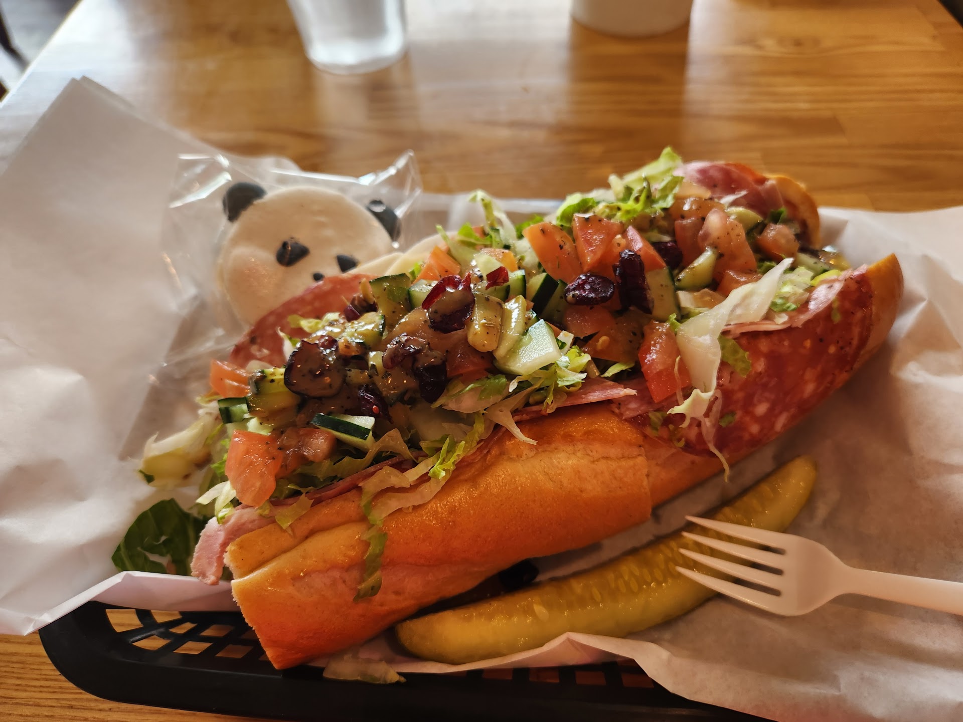 The Mar looked burnt but the bread was fine, it held up well and had a nice chew. The Mar is a tuna sandwich with capers, celery, white onions, lettuce, Havarti cheese, chopped cucumbers and tomatoes. It's a bit dry even with the garlic aioli but the tuna was well seasoned.