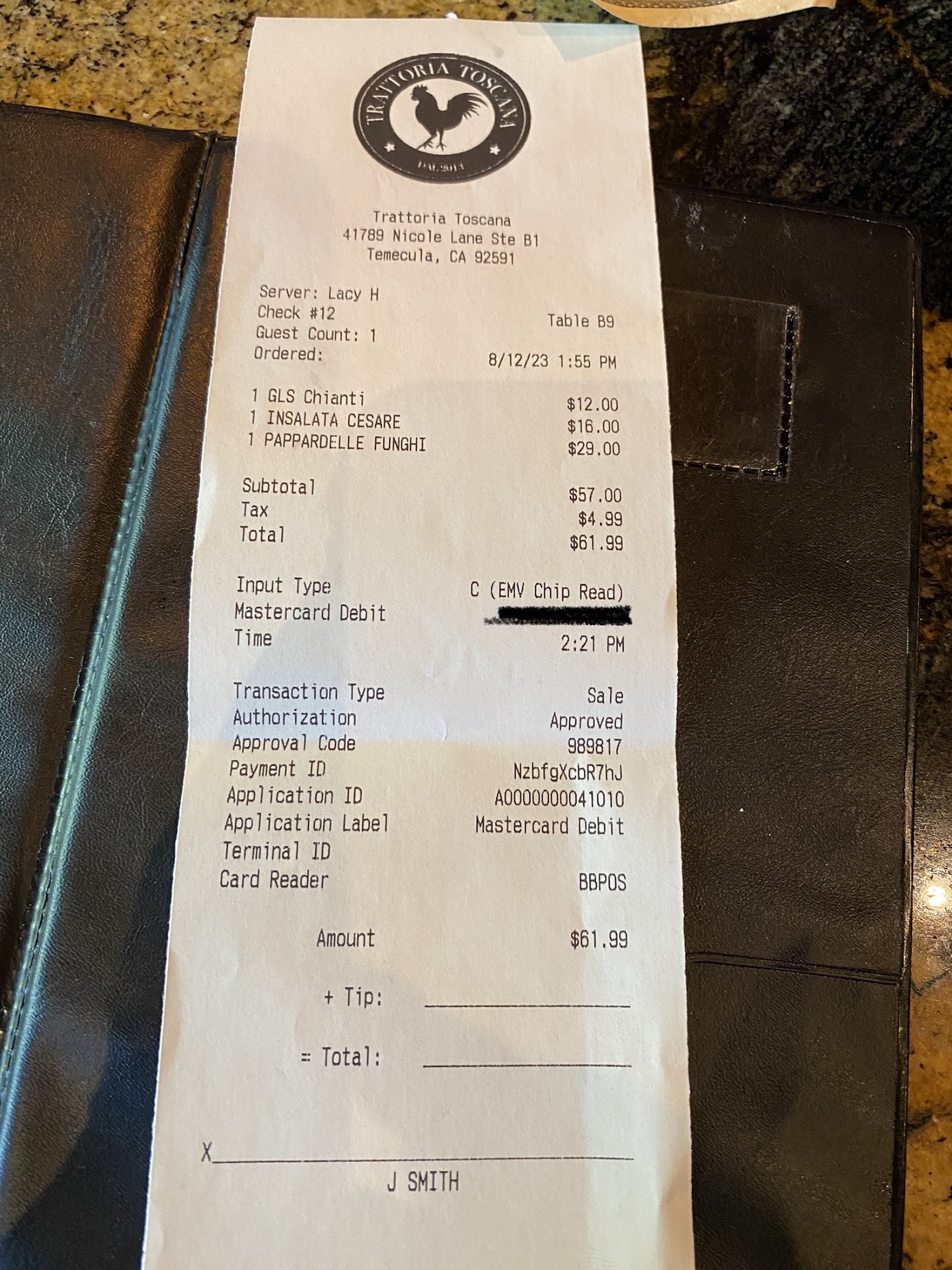 Read moreI first tried this place about 18 months ago and I have since been back maybe 40 times or so, not kidding at all. I have had almost everything on the menu, my wife on the other hand, sticks to her favorite every time....the filet mignon filled tortellini. It’s ridiculous and she rarely shares.....as in she never does. Everything is Italian so expect nothing less. It’s all hand made pasta that is never frozen. You won’t know what that is unless you make it yourself and consider yourself a pro, been to Italy, or truly understand authentic Italian food. All the wine is Italian and their selection is awesome. I’ve never encountered a waiter who has not come to the table full of knowledge of every dish and a pairing of wine. I have read other reviews and I just make mention of a few things. They are on Italian time, they expect you to sit, relax, and enjoy your meal. You don’t need dinner and a movie....do as we do, go to Trattoria Toscana and spend 2-3 hours there just taking it all in. There really is no rush. I’m pretty sure we have exceeded 4 hours and have closed the place down a few times as well. They are passionate about their food because they hold themselves to the highest Italian standards. Expect the best and say something to them if you are not blown away. Don’t eat, leave, then suggest/complain how it can be better. I love this place. It’s the only Italian food I will eat here in town unless I’m cooking in my own kitchen. They just catered our wedding in April and every single person said the food was amazing. They had one complaint.....it was in Temecula and our wedding was in Rancho Santa Fe and it was a far drive for them. Anytime our friends come from San Diego, they always ask the same thing, are we going to Trattoria Toscana? The answer is...