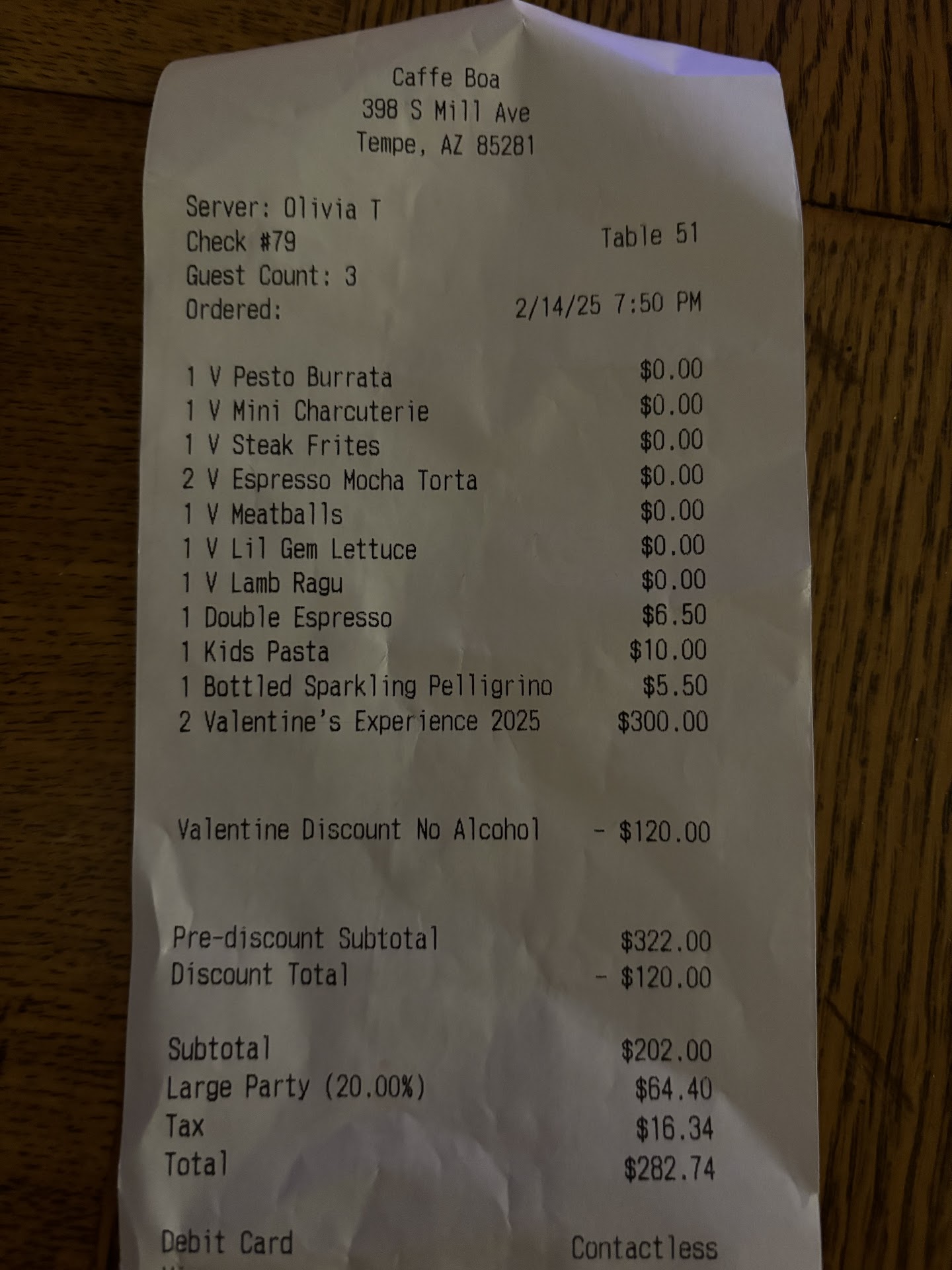 Read moreThis was my second time dining here and I’ll say the only complaint I had was about the service. I know the food is very good which is why we chose this place for Valentine’s Day. From the moment we sat down I felt judged or predetermined to be a difficult or a no tipping family when we decided to bring our well behaved 7 year old daughter. All the other servers in our section were very attentive and accommodating to their guests while we felt like our server Olivia was not bothered to upsell, offer recommendations or even make sure we had enough silverware or water on the table. I understand that for Valentine’s Day they were offering a limited menu that was $150 per person or $100 per person if no alcohol was ordered. We opted out of alcohol for the evening just to be brought the bill with the standard price of $300 for two people drinking. We informed her of the error just for her to return with a corrected bill but with an extra 20% gratuity included for “large parties”. I did the math only to find that the gratuity claiming to be 20% was actually closer to 27% of the bill. I calculated the bill and the correct 20% tip which should have been $48-$50 which is still great if you ask me for doing nothing but order taking. Because I didn’t want to be those people, we just told her that the total doesn’t add up instead I should’ve asked why gratuity was included for a party of 3. So she left and came back with an extra $20 off the bill still leaving the $64 gratuity she intended on giving herself. My husband ordered an espresso with our dessert only to receive the dessert and no espresso. From the moment we ordered the dessert to the moment she finally checked on us halfway through the dessert it was probably 15-20 minutes we had to remind her that we ordered an espresso. Once she returned she said that it had just been made but it was cold. I work in the industry myself and I know what it takes to offer above and beyond service (more than 20% service). At this point we just paid the bill and she walked away with almost a 30% tip with less...
