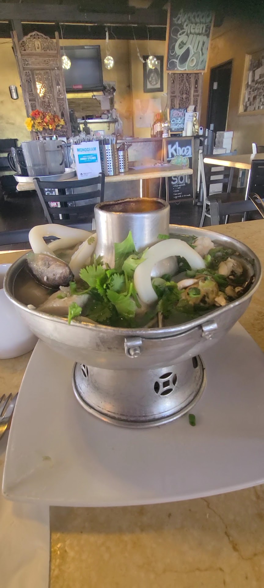 It was my first time here, and I mentioned it to the manager. Plenty of seating. The menu selections were overwhelming. I wasn't sure how to order and the manager was not very helpful. I ordered vegetable roll but I was trying to order fried rolls and ended up with both. The crab puffs were crunchy and vegetable rolls were very Good!! I was fighting the very large fat flies that kept nose diving at me and the appetizers. I managed to kill a few of them with the menu to be able to eat calmly. The "seafood soup" caught my attention from another goggle review. It took a while (20 min) to get the soup order out to me. At least they bring you large mug of chilled tap water with a cucumber on the bottom. The volcano presentation was very cool, but I was sad to see the "seafood soup" only had 1 tiny piece of fish, 3 pieces of shrimp, 6 green colored clams and 8 white onion shaped squids. No oyster, no scallops. Caution: it was heavily loaded with Ginger! You have the option to add spicy levels of 1 to 5. When I tried to order half steamed rice, half choi mein, I was told they had to be 2 separate orders which I ended up taking to go. The Pineapple rice place did not have that much pineapple and was not as sweet as I thought. I needed to add sweet and source to make it more tasty. While waiting for food, i noticed the manager was eating at the register. She was gloved up but kept touching her face, mouth, nose with same gloves that she used to serve food plates, serve water, move glasses and cups-- not once did she change gloves. I didn't see her leave to wash her hands either. Maybe that's how you get the Thai flavor? I was the only one there and it was challenging to get their attention for green tea refills. I was dissapointed to get a regular hot water cup with a Kroger green tea bag. I had to call them back for sugar a couple of times. The to-go food had very large portions. They give you a complimentary orange sherbert to end your meal. Saw several large families with kids come in and they were easily accommodated. Overall a decent Thai experience though a bit pricey and there was a unexpected longer wait time for...
