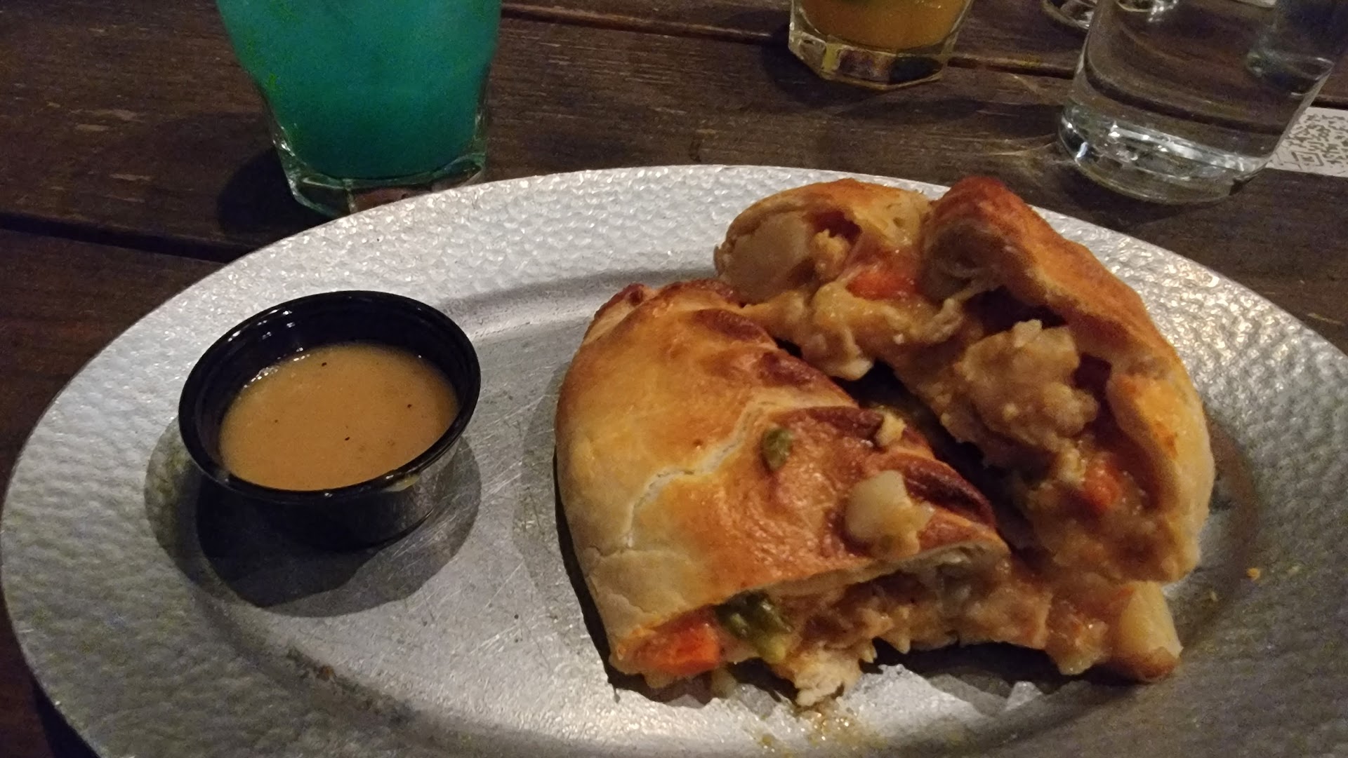 The staff was great, answering any questions we had about the menu and service was well-paced. Now...the FOOD! As a (mostly) vegetarian, I was pretty blown away by the options - I have to eat a lot of veggie burgers elsewhere - but this place has a whole vegan/vegetarian page of items, some of which include veggie chicken and beef. Forget what anyone else has said...nothing could be better than the Eggplant Parmesan pasty! ;) My sister also loved her Lamb and Mint pastie, saying it was "effing delicious" and that the mint was not overpowering. The pastry is not doughy like pizza crust, but rather flaky and crispy like a biscuit. The vegetables were cooked perfectly, as they were fresh and still a little crunchy.