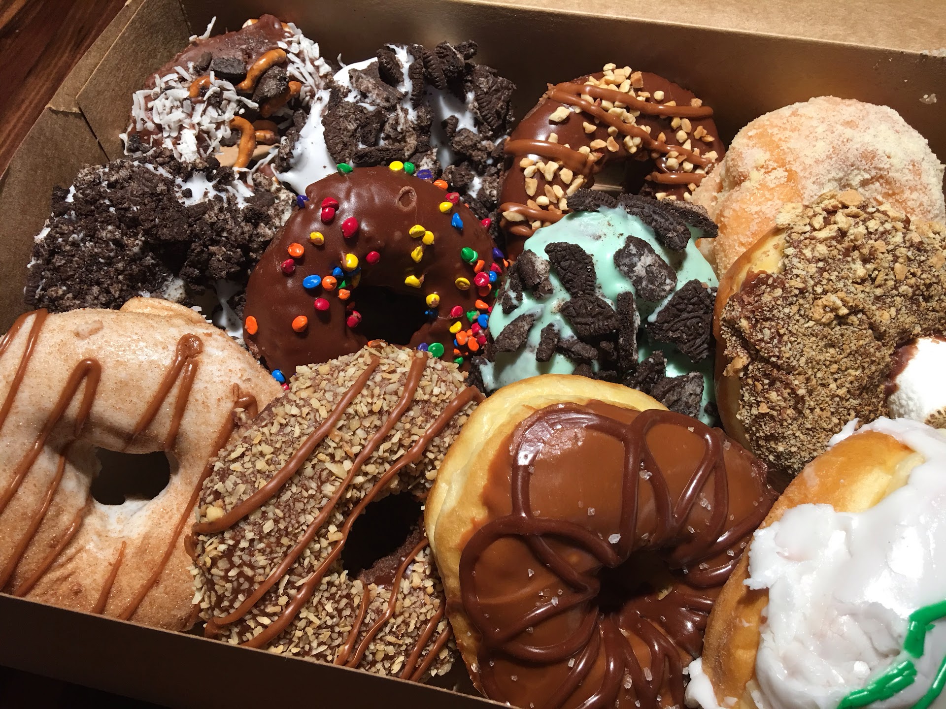 Came across this donut shop on Yelp & was intrigued by the number of high reviews & the unique donut combinations/flavors, toppings & names. Luckily, we stopped by after eating dinner last night to check it out. We were just going to get donuts to bring home since we were pretty full, but decided we had to try one of their donut milkshakes while we were there. So glad we did--it was amazing! I ordered the blueberry struesel to share with the hubs. Yum! They actually put the same ingredients that go into the donut you choose in the milkshake + little chunks of donut & serve it with a full donut on top. So. Good. You will definitely get your carb & sugar fix here! The whole family loved the concept & vibe they have going & my son (& his friends that he Instagrammed) also loved that it's a 24/7 donut shop. The interior is spacious & clean (although, you could tell they'd just come off a rush maybe earlier with some crumbs on tabletops & a little icing on a chair or two here & there). They got busy quickly after we arrived--I guess more people had the donut-for-desert idea (or maybe donuts-for-breakfast idea). We thought the staff was helpful & pleasant; the owner came out & chatted with us too, checking on our satisfaction with our order & experience (a nice guy from New York). We ordered a dirty dozen for our order for home so we could pick our own donuts. I had half of my Jesus & half of a caramel delight this morning with breakfast coffee. OMG so good. The Jesus is cinnamon-goodness (think of a churro or horchata in cake donut form) & the caramel drizzle & peanut crumble on the chocolate cake of the caramel delight was decadent. These are dense donuts & will fill you up. Next time (oh yes, there will be a next time!) I'll have to try their coffee too (it's nitro) & some of the other amazing donuts--including the ginormous cinnamon roll and fritter someday. One suggestion might just be for a heads-up to customers that because the milkshakes are such a specialty shake, it takes just a few minutes before that comes up to the counter. (Worth the wait, but just good to know in advance so you don't start thinking it was possibly forgotten...
