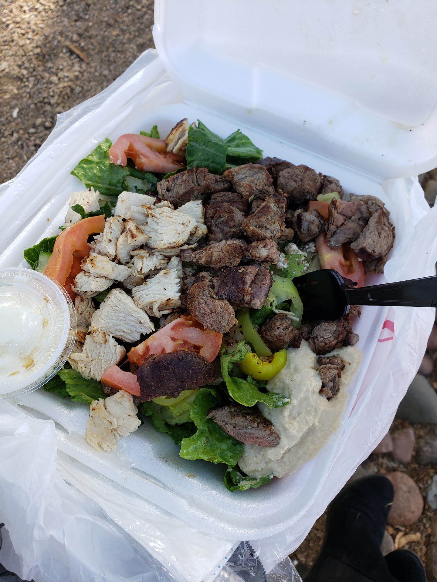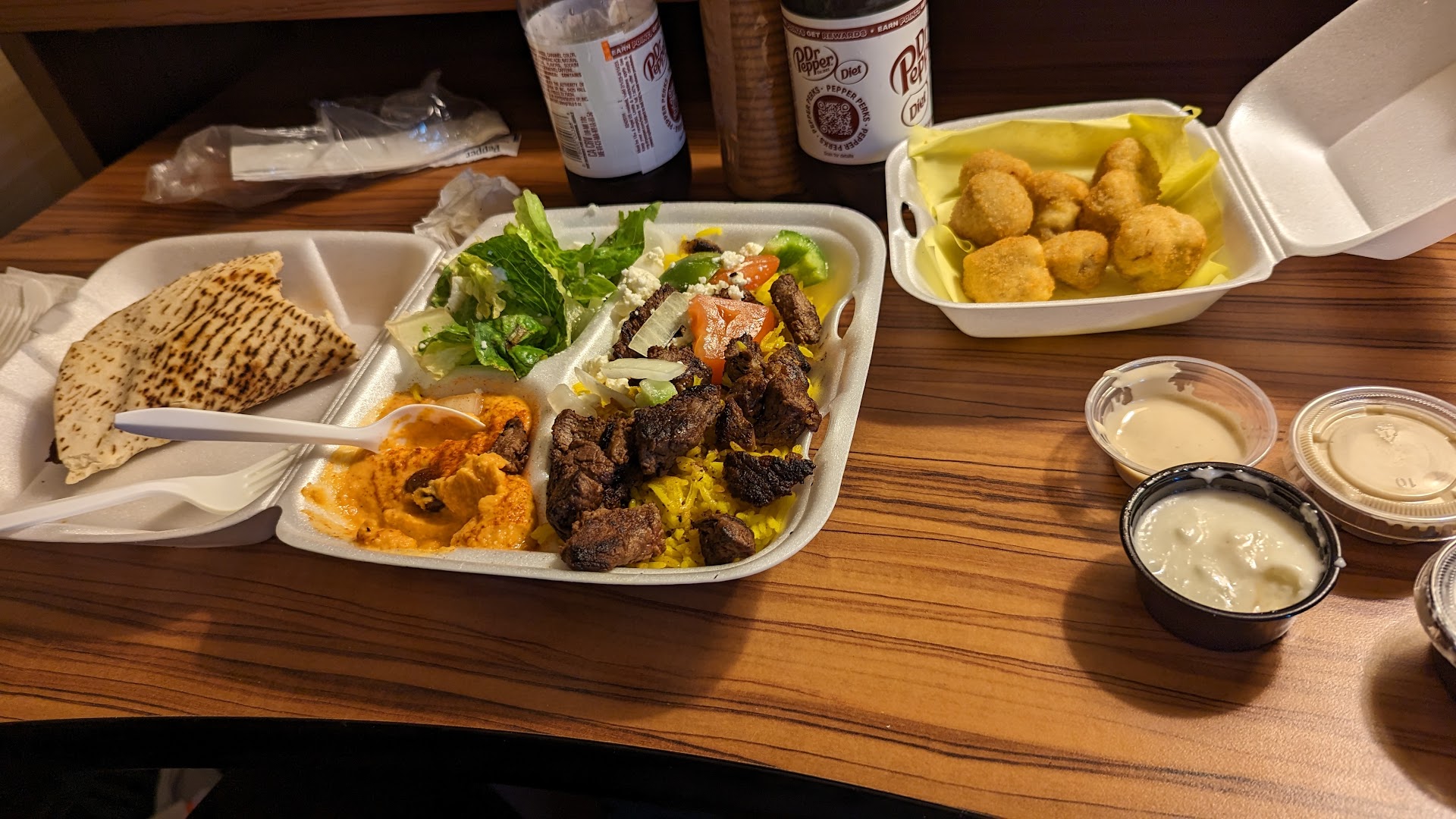 Starting with the positive - the beef is really good. Cooked medium, nice flavor, etc. Rice was really really good - and they give you plenty of it. Hummus was fine, but not a highlight. Salad was fresh. But, to start with the not so good - there was no dressing on, or included with, the salad. Further, I had ordered tahini as the main sauce, but added garlic sauce as an upcharge. Received the up-charged garlic sauce, but no tahini. Unfortunately, the fried mushrooms were underdone. The batter was soft enough that it just slid off when picking up a mushroom. And, they hadn't included the ranch that comes with it. I caught that before I left, and she just said they ran out, but I could choose something different. However, had I not checked, I wouldn't have had anything to dip them in. Lastly, the order was confirmed for pickup between 555 and 6pm. I always come a little early so I can get it right when it comes out. I arrived at 540, and it was already sitting there done. Had I come at the early estimate of 555, it would have already been sitting there...