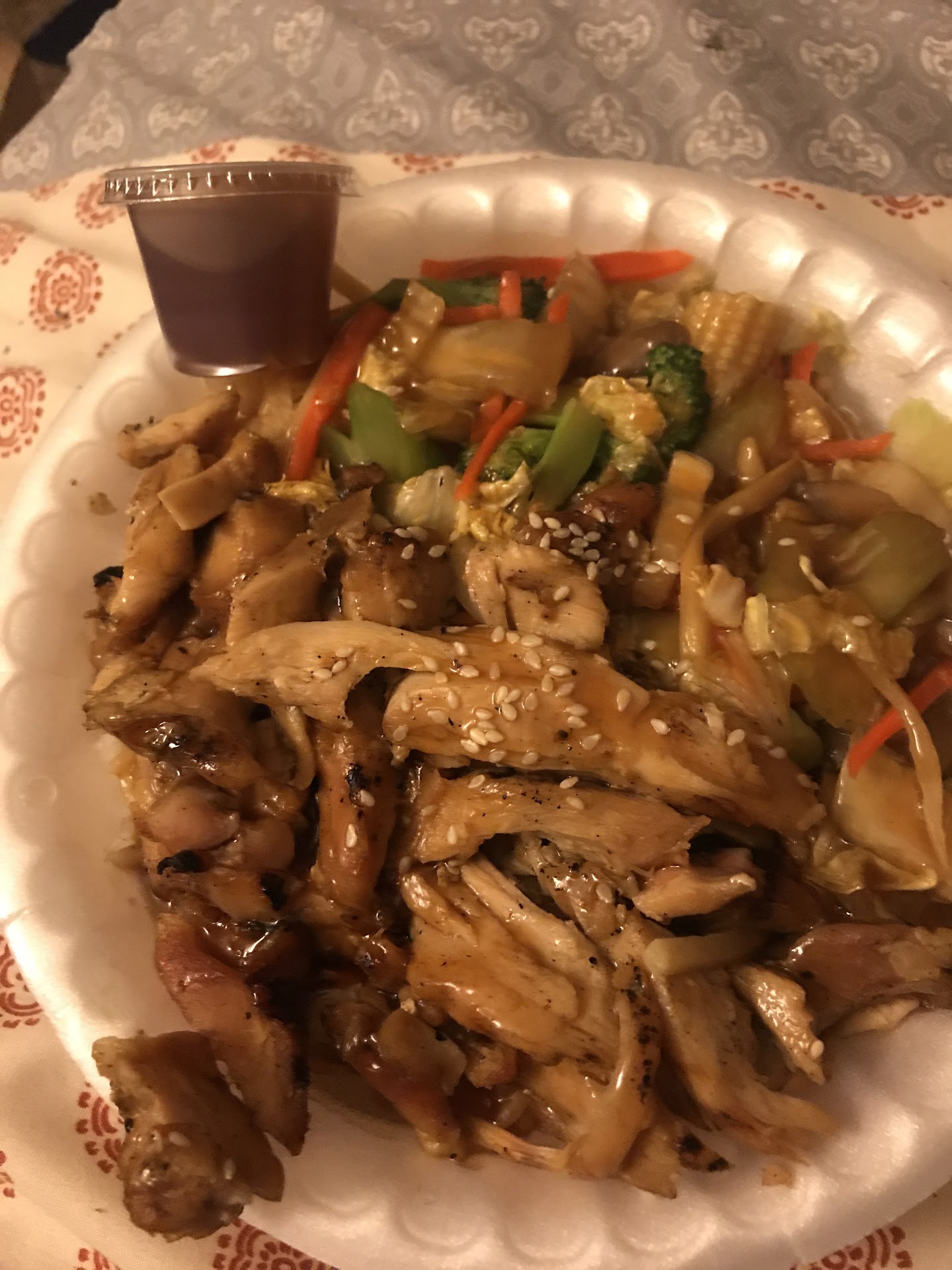 Read moreMy husband and I got takeout orders. He got a teriyaki chicken with fried rice. The man told us it would be a little extra for substituting white rice with fried rice. They would not do half-and-half on the side, so I got an orange chicken with all noodles and we took it home and shared it. The price on the menu was $12.49 for the large bowl But somehow two bowls with the substitutions wound up being $33.60. Before I knew how big they were, I put the rest of the change in the tip jar to make it $35 spent. The amount of meat on each bowl was not very much. The teriyaki chicken had a really thick sauce that was not good. The bowl was mostly rice or noodles. The orange chicken was the same. There was a little bit of chicken on top one layer and then the whole bottom of the bowl was noodles.. I do not recommend. I guess I’m used to occasionally getting panda and their portion sizes are much larger and the amount of meat is much more. I feel bad because I wanted to support a...