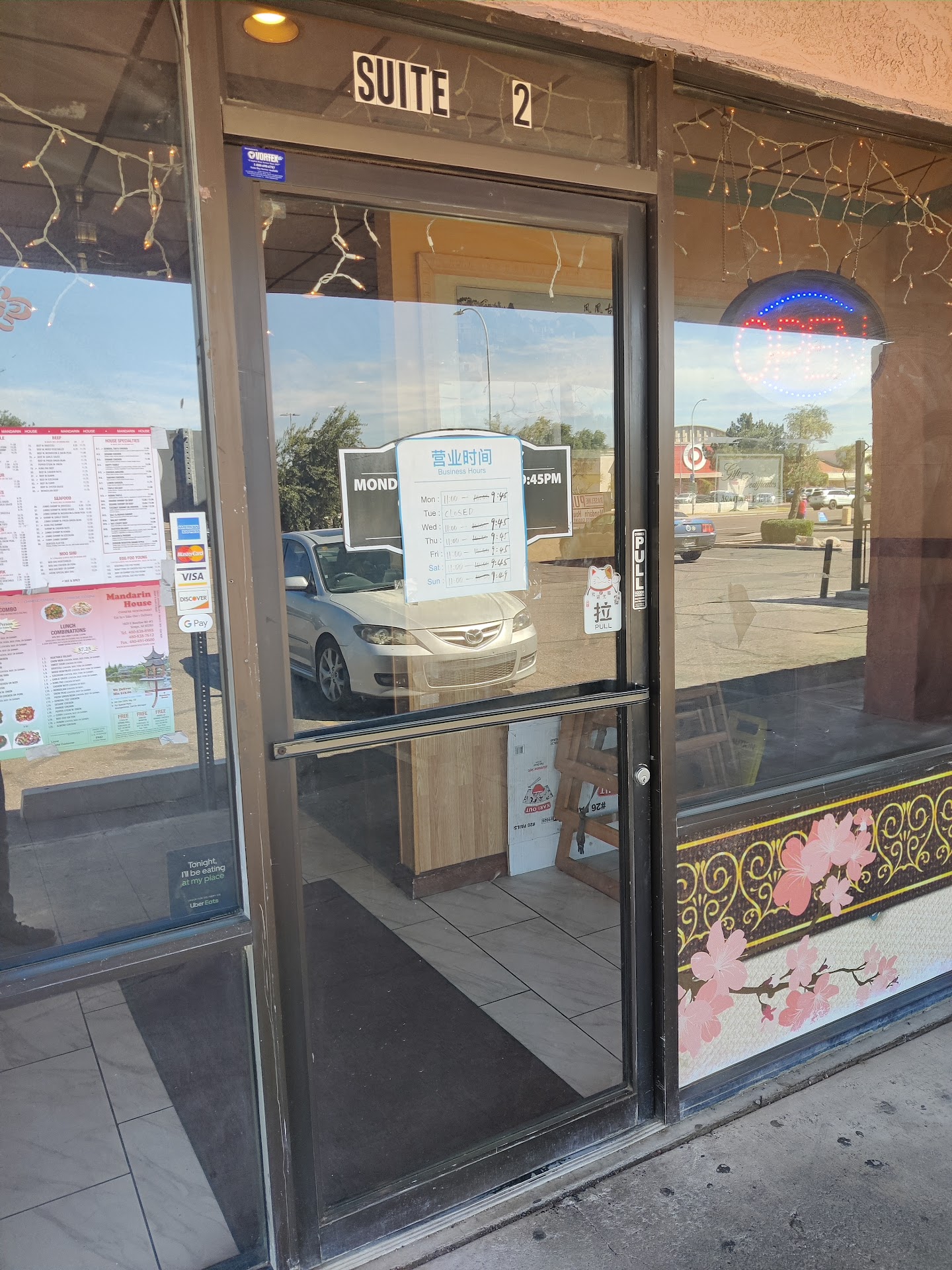 Food: We ordered two large dishes (kung pao chicken and broccoli beef, added cost option) with added spice, one normal dish (steamed tofu/veggies) with added spice, and three sauces (that accompany the tofu dish).