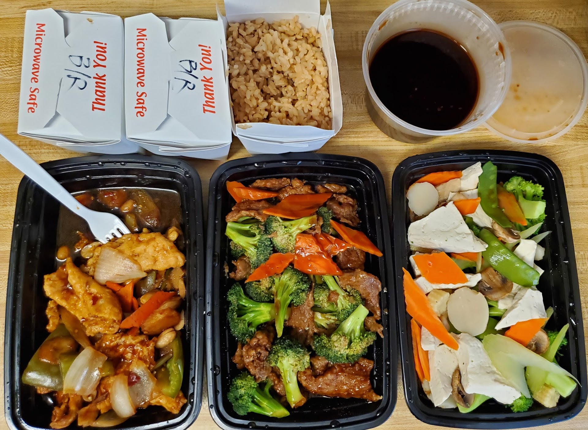 Pictured: 3 small entrées (~1.5- 2cups in each), 3 containers of brown rice, one house special sauce container.