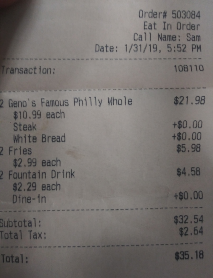 Ā Ā Ā Read moreOn 6/2/17 I placed an order with Postmates for a Geno's Philly cheesesteak and an order of boneless wings. I received my order with a receipt stapled to the bag (which stapled the bad shut) and the receipt had my exact order on it correctly, however when I opened the bag my order was incorrect. Inside the bag was an order of wings but a turkey sandwich instead of a Philly cheesesteak. Since I already paid Postmates for a delivery fee and the receipt showed the correct order, I contact Geno's directly and spoke with a Maggie. When I explained my order and what happened, Maggie said to me "So that's what happened to our turkey sandwich, we've been looking for that" and she was sorry for any inconvenience and added a $15 credit to my order (because if she sent someone back out they would charge a delivery fee and I was already charged one).