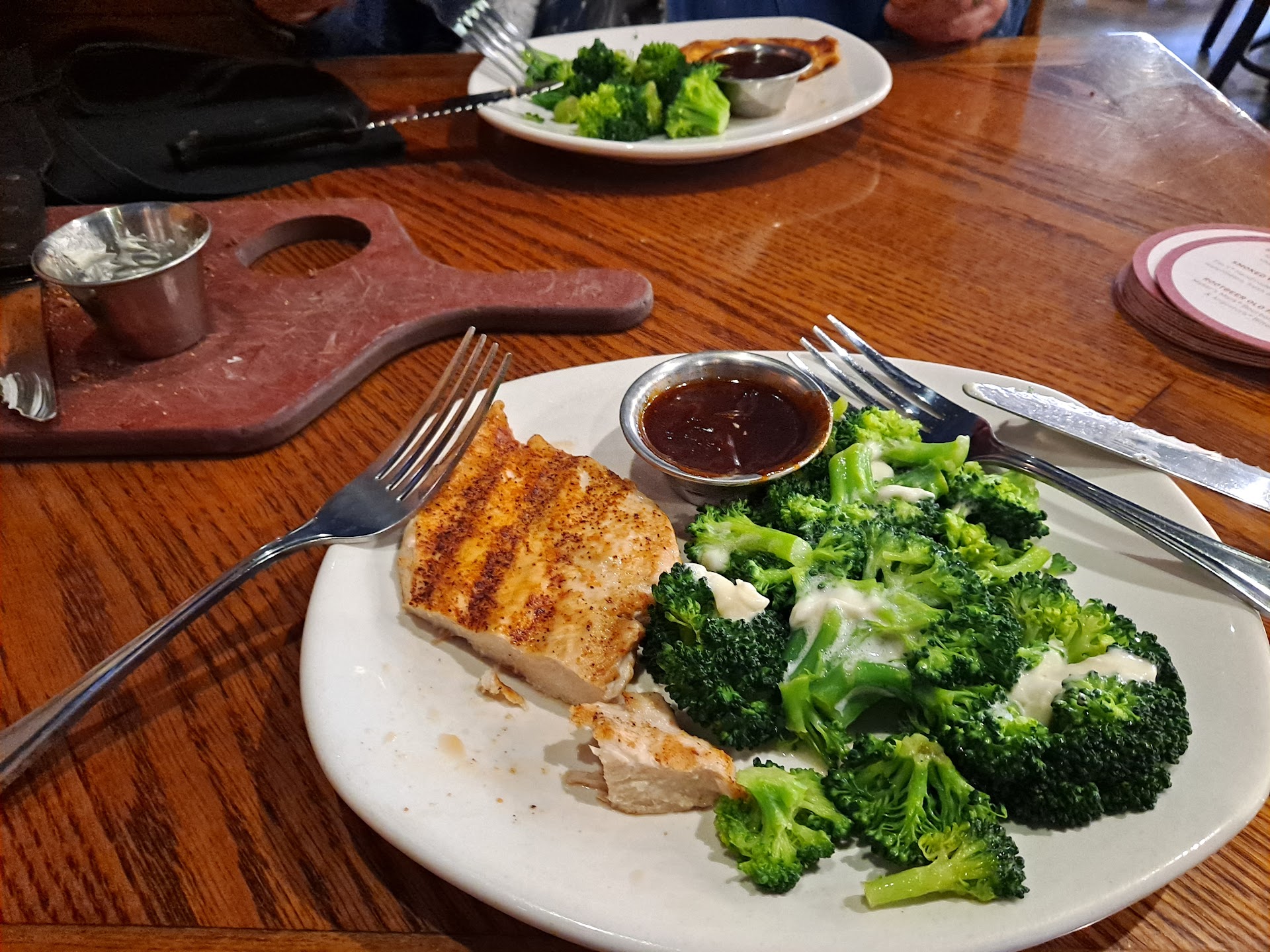 Ā Ā Ā Read moreI have dined here hundreds of times and until last Monday night I have never had a complaint. 5 of us were celebrating a friend's birthday. The place was busy, and understaffed. We all had water, two had mixed drinks. I unwrapped my silverware to find two stained forks and a dirty knife. I asked the waitress for a new set when she came back with the bread and to take our order. The salad came out next, 10 minutes later. My friend gave me one of her forks to eat it with. It consisted of some lettuce, one cherry tomato and 1/2 lb. of shredded cheese and a teaspoonful of dressing. About 20 minutes later or meals arrived. My steak was perfectly done but I still had no knife to cut it and my potato was half cooked. The birthday girl ordered a baked sweet potato which was charred beyond belief and so shriveled you couldn't even scoop any of it out of the shell. Her salmon was 1/2 the size of the other person who ordered it and was WHITE, not pink. The waitress asked if she wanted a new potato, and then sent the manager over when my friend complained about the salmon, which she said didn't taste right. He told us all how unusually busy they were and offered a discount on her meal. She opted for a new meal. A waiter came with the new sweet potato 5 minutes later, and the salmon came 5 minutes after that. I never got my own knife but luckily another friend had ordered shrimp, and didn't need her knife. She never got sauce for her shrimp and ended up eating a few and taking the rest home. We had dessert and paid the check and left. This one incident won't stop me from going there but I hope the service and the food is...
