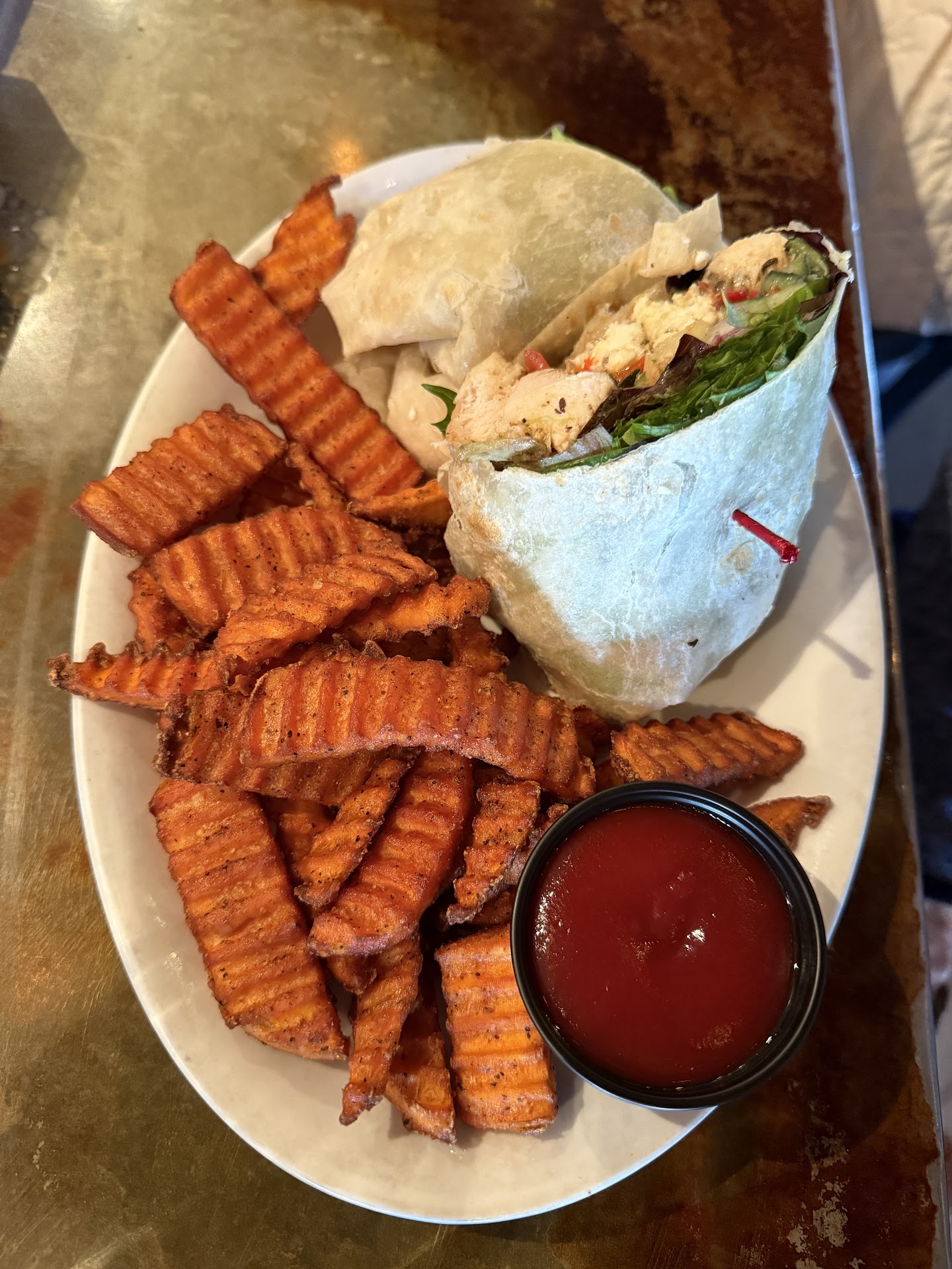 Our server came around quickly, started us off with waters, and it wasn’t long until we placed our orders. I ordered the La Lucy in a wrap with chicken and a side of sweet potato fries. Whenever there are sweet potato fries on the menu as a side, TRUST I will be getting them. My mom ordered the Mediterranean in a wrap with chicken and a side of the sweet potato fries too.