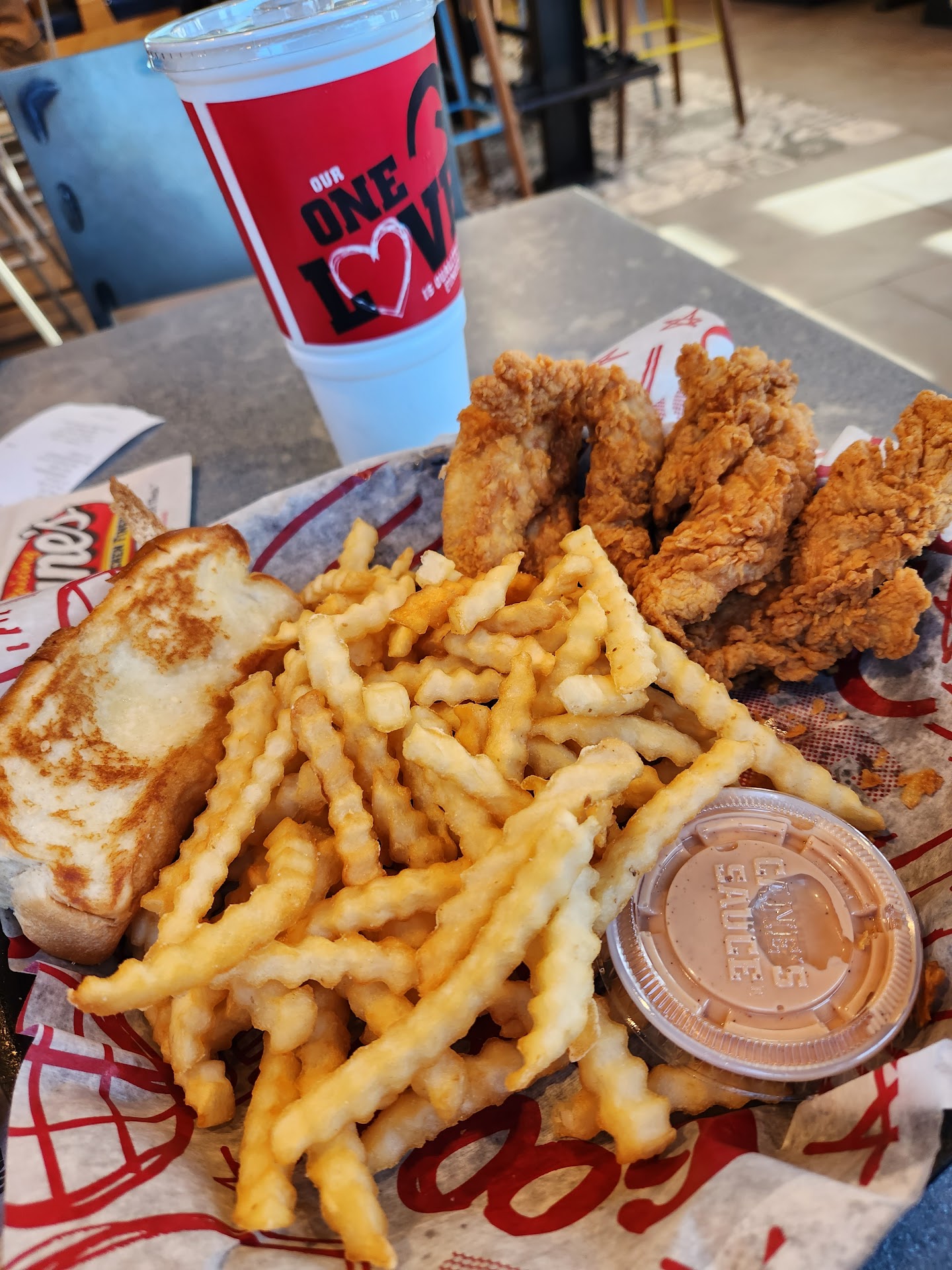 Read moreWe were going to have a sit down dinner about an hour after going here (I was starving and needed something to hold me over and I wanted to try the famous Raising Canes), so I only ordered a kids meal and split it with my mom. The chicken tenders (what they are known for and the only thing they make… I think?) were PHENOMENAL!!! Seriously, so flipping GOOD!! I am a die hard Chick-Fil-A fan, but these chicken tenders blew them out of the water! I don’t know what it is… the coating? The seasoning? The chicken? 🤷🏼♀️ But I haven’t stopped thinking about them, and now when I go to Chick-Fil-A, it just isn’t the same, sadly. I live near Seattle, and no Raising Canes nearby. Luckily, my parents live near about 5 of them, so I know chicken tender heaven is in my future. Cannot wait to introduce them to my family in April. If you are reading this as a person who wants to see what the hype is all about… RUN. You won’t be...