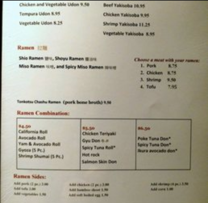 I ate lunch here last week on a Wednesday. It looks like a little hole in the wall, but it seems to be somewhat popular with the 30 year olds. I was not that impressed actually. The restaurant was kind of drab and I thought that the menu was a little overpriced. I questioned the waiter on what all these differently named ramens were and he seemed not to really understand it either and seemed annoyed that I wanted to know. Well there's no explanation for them on the menu so how would the customer know what they all are. So low score for customer service and ugly non explanatory menu. I asked him if they used MSG and he's delightfully said yes which is not a good thing so I told him I did not want MSG. He seemed to be really perplexed at that but MSG is a bad chemical used in food to enhance its flavor. A lot of it was pork-based and I am a vegetarian so I did not want any pork based soup. It's a good thing I questioned him as to what was in the soups so he finally understood what I wanted and came up with a spicy vegetarian base with no MSG. I don't know if that's what I got but that's what I ordered. We got the spicy one. it was okay. My son-in-law also ordered the spicy tuna roll which was about $5.99 so his bill actually came out to be $16 which I think is a little high for a bowl of soup and a few rolls pieces of roll. I know this because I paid for it. When I looked at who was serving there was only one Japanese looking kid behind the sushi bar and one female and then our waiter was a redhead so I don't know if it's authentic or not. I wasn't impressed. I might go back but probably not. There so many other better...