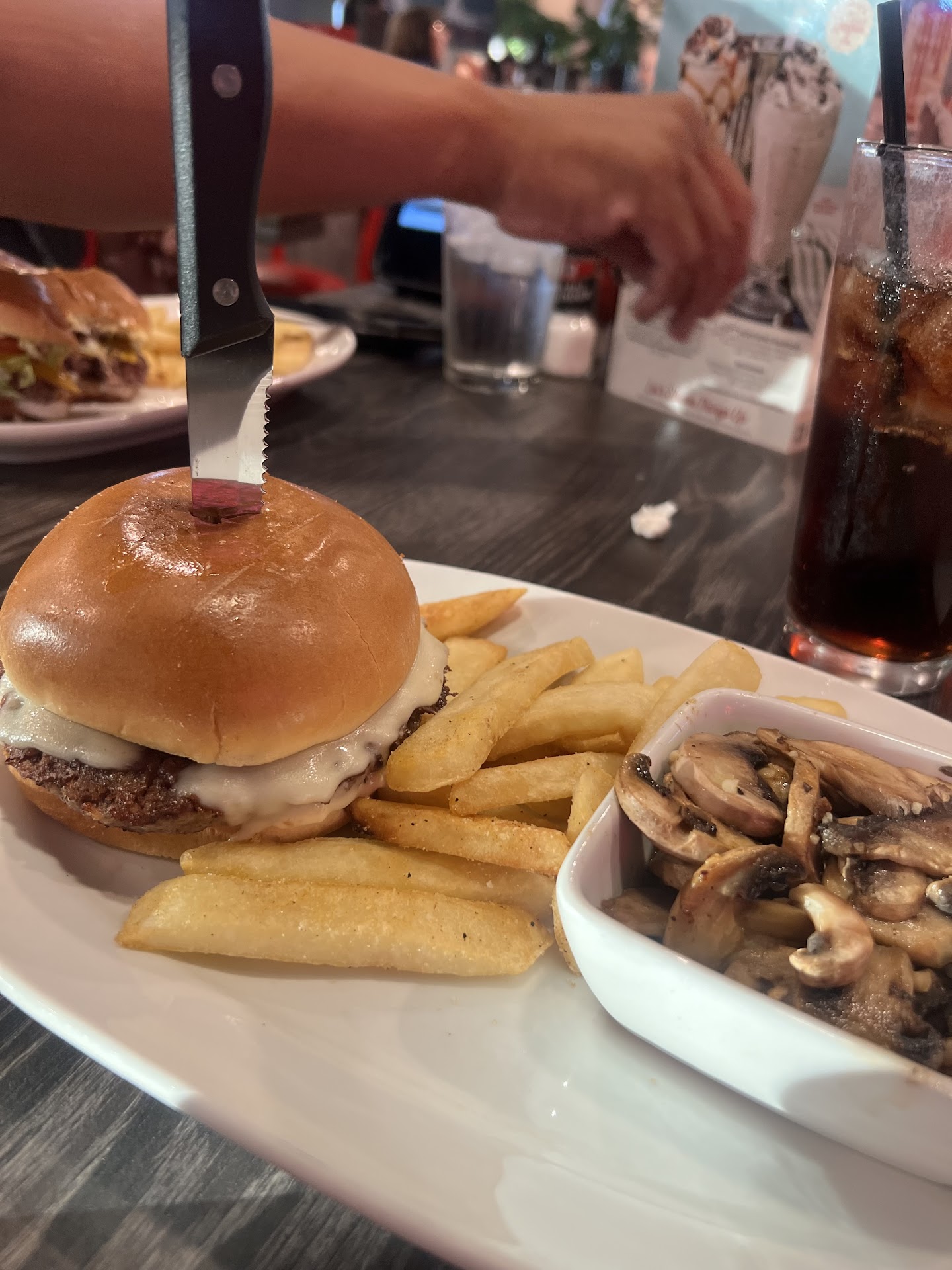 Food was good. We ordered a double tavern burger which she described as “two kids patties”. Thought it was a bit odd that Tavern Burgers are highly advertised on the menu with tons of pictures and recommendations then downplayed hard when asked about them. Absolutely love the bottomless fries with the RR seasoning on them. And, really love that they’ll bring you any and as much of their numerous sauces as you want, and I love sauces! Particularly like their “campfire” sauce and the homemade tasting ranch. The other burger ordered was the Blue Ribbon. It was pretty big, tasted good and cooked close to the right temperature, which was good. Burgers are good, but definitely feel a bit more “mass produced” than “custom made”. They don’t “wow” you, but are satisfying. Tip: they won’t cook them “medium rare” or lower, and if you ask I’ve had them go into a multi-minute diatribe several times on why they simply call it “some pink”, just roll with it.