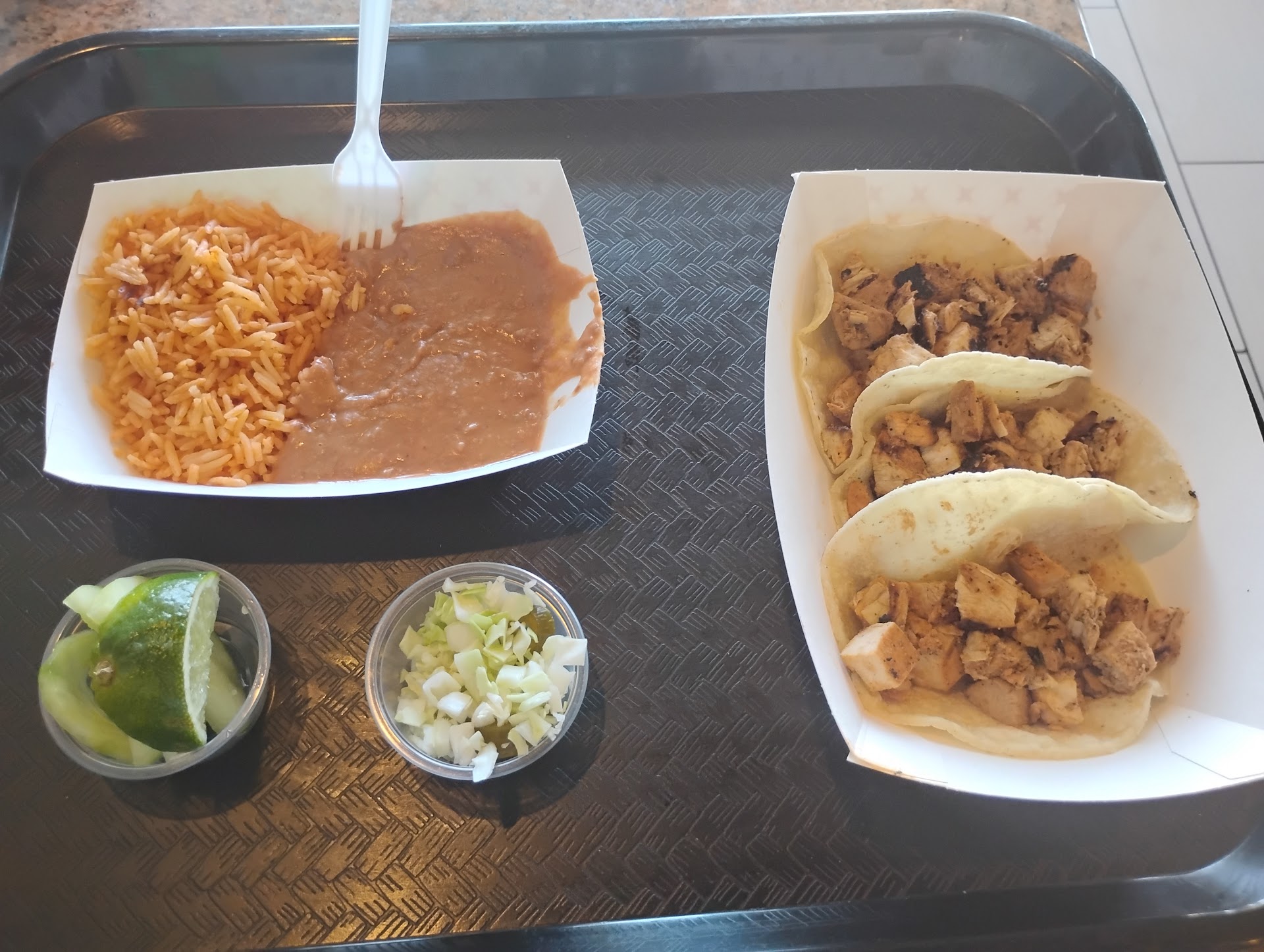 (Wife’s order) “suggested by employee” Combo #1: 3 carne asada tacos, rice and beans with a drink. Pico, cabbage, avocado salsa and lime added at salsa bar. She absolutely loved it and that’s really saying a lot because she hasn’t held down food well at all during this pregnancy.