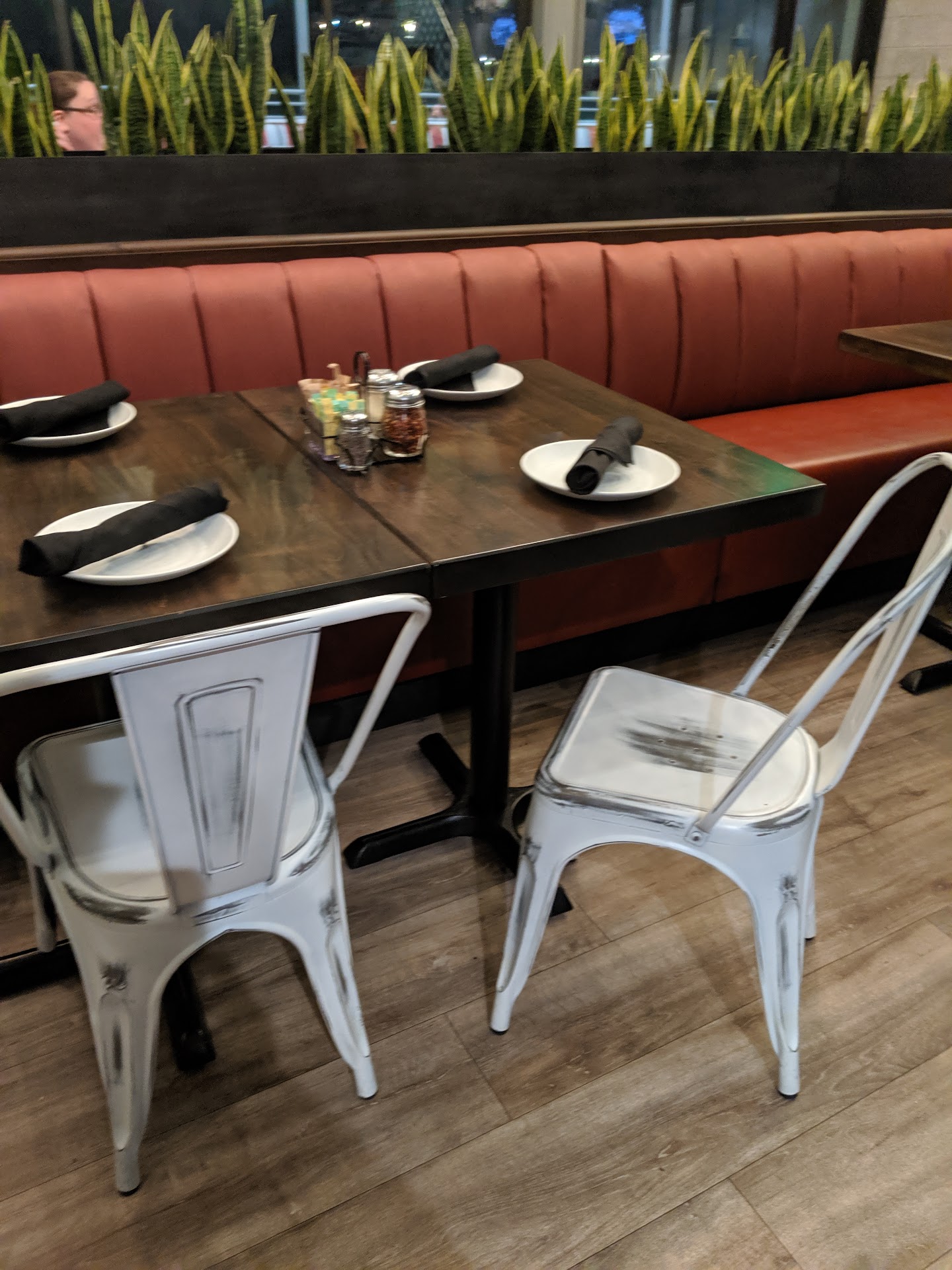 From the gold stools up front to the green backed booth seats in the back this place is fun. You are walked through the sports bar area to the back restaurant seating. The bar has 2 TV screens and a beautiful arrangement of bottles. Over head is dark wooden box pattern with track lighting in the center of each box. The counter has clear barriers separating patrons sitting at the counter top of the bar. The main room has 3 fantastic chandeliers whose effect is magnified at night by the reflection of the movable windowed wall. The wood and plants make this place fee comfortable. Out on the patio is more seating with huge box heaters that make outdoor winter dining very pleasant. There is a giant 10 seater table around the corner and is also surrounded by plants. I can imagine large family gatherings here. There is also a shortcut to the parking lot from the patio if you don't want to go past the bar.
