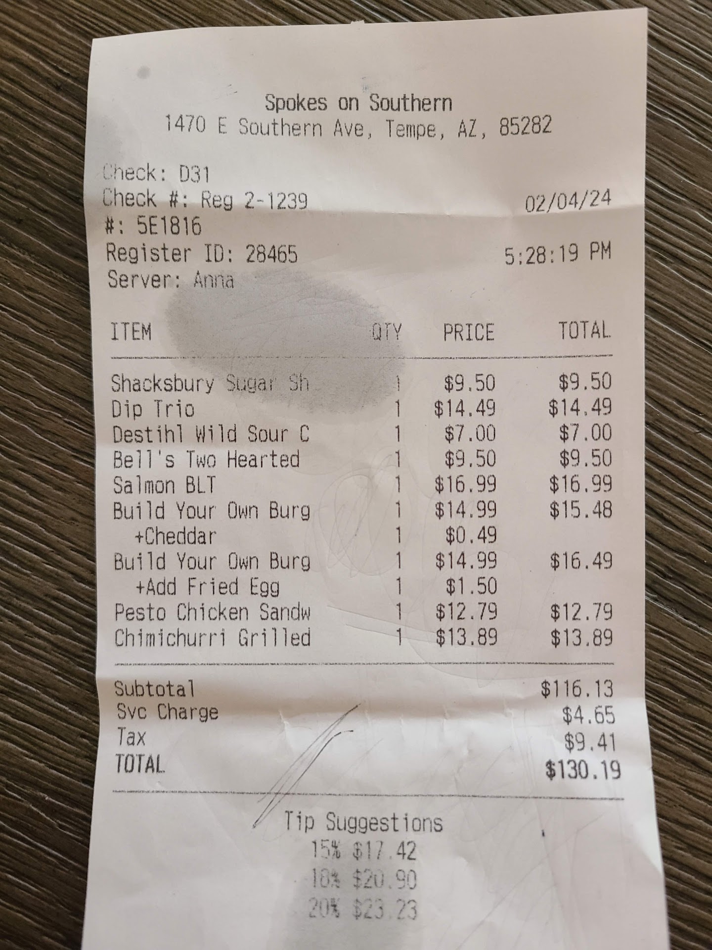 I have mixed feelings about our 1st visit to Spokes. Overall, the food tasted good and the small lake near the patio was pleasant. But even with those, we likely will not be back.