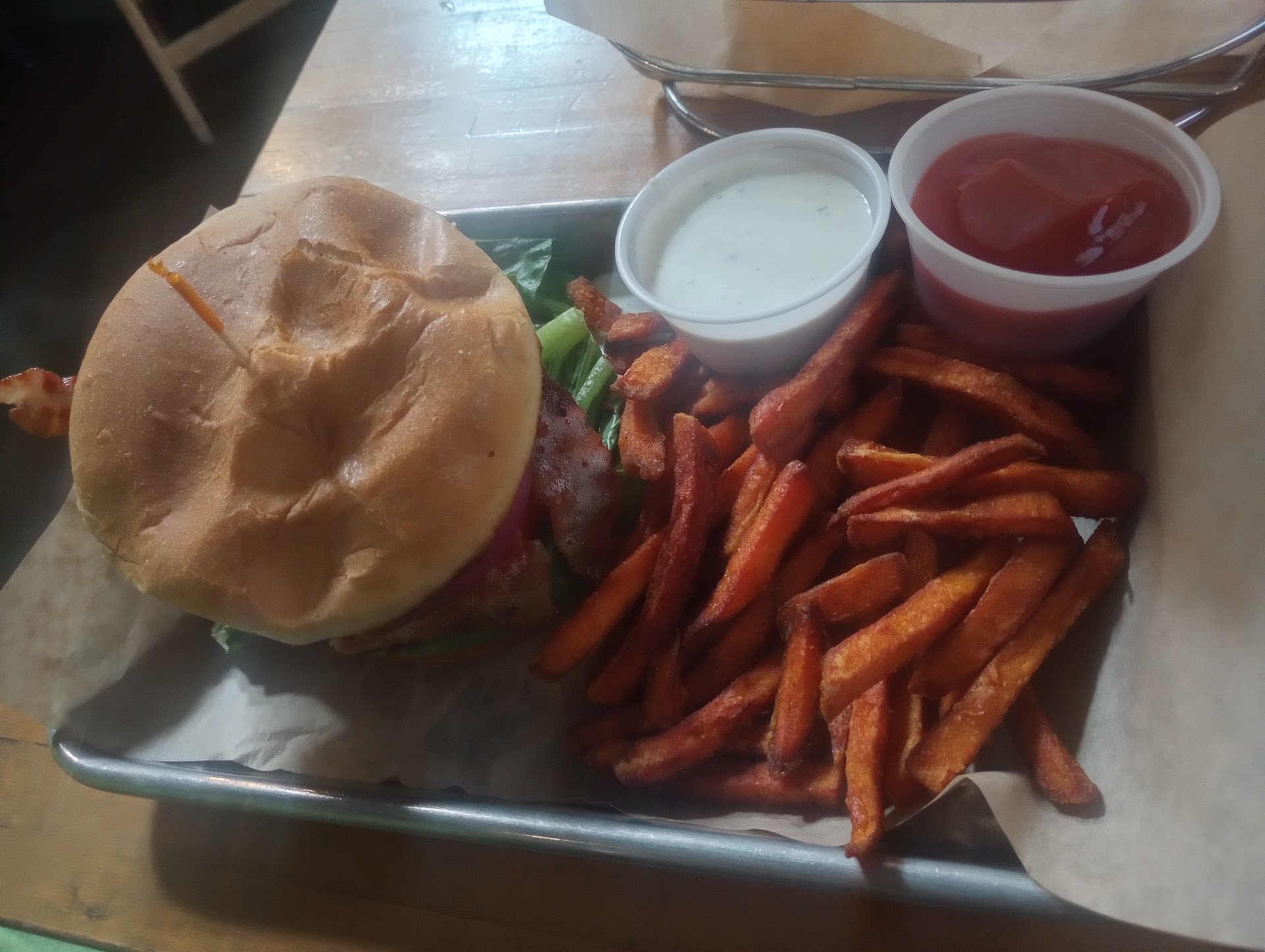 Read moreThis place has a lot going for it. It is in a great location and the layout looks like it would be great to either dance, drink, mingle, just by walking a few feet to a different area. The service was way above expectations. With some of my family having a gluten allergy, the employees were extremely knowledgeable in what would be safe, they even brought up that their fryer was a shared, their barbecue sauce had Guinness in it, so not safe, and made recommendations for a safe alternative. They kept our drinks full and knew their drink menu and made recommendations based on what we liked and their drinks were really good. What brought their rating down was their food. It was just blah. Yes it is a bar/grill, but the flavor profiles of the food were a little off. While the fries artichokes and dip were really good, other items fell short. I had the mushroom Swiss burger and only ate half of it because there was no taste. I had a couple bites of my wife's brussel sprouts and thought the balsamic and bacon would pair well with the sprouts, but it was just off. My son, who I swear has a hollow leg, didn't even finish his burrito. The stuffed pablano was overpowered by the sweet potato and drowned out all the other ingredients. Their wings did save them, however. They were cooked very well, not dry or undercooked, and the glaze they used was superb. I can see this place going far and lasting a long time if they can just bring up their food game. I will give this place another try...