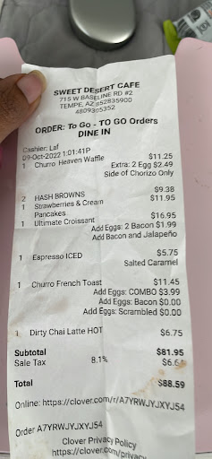 We get home and realize the side of chorizo is soupy mystery meat. I asked did they sell it on the side but, they didn’t tell me how it was as prepared. It has to come from a can!!! I wouldn’t feed that stuff to my dog!!! We were also missing the side of bacon and jalapeños for my daughter’s sandwich. The waffle was VERY OVERPRICED for what we received. The waffle was gross!!! Without syrup it’s BLAND and TOUGH. With the cheap syrup cup they give you it’s too sweet.The Churro French Toast wasn’t cooked well. Very doughy.