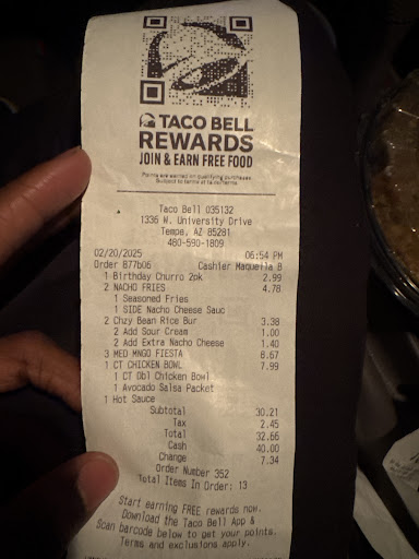(tonight, 2/15 at 7:35pm) This time, the guy didn’t give me a receipt, but forgot 2 items in the bag. the items that WERE in the bag (tacos) were not wrapped in paper and look like they were literally chucked in the bag, sour cream EVERYWHERE. It was honestly pretty comical at how terribly bagged the order was, one of the tacos was upside down, no paper and broken as it was on the bottom. wth.