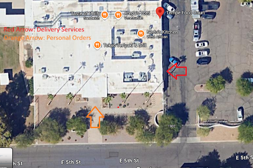 (See lots of complaints about time or not having stuff so you can eat) Please keep some things in mind, as that might clear some issues up The folks you see behind the counter do not work for were you ordered your food from The place is meant to be a pick up and take somewhere and eat. (home, friends, party, ect) When you order it (ask for the needed items from the kitchen you ordered from: straw, extra fork, ect) The folks behind the counter are there to help if you have issues picking up from kitchen The time delays are from the kitchen, and may happen at peak times It has 2 different entrances, take a look at the pic if needed