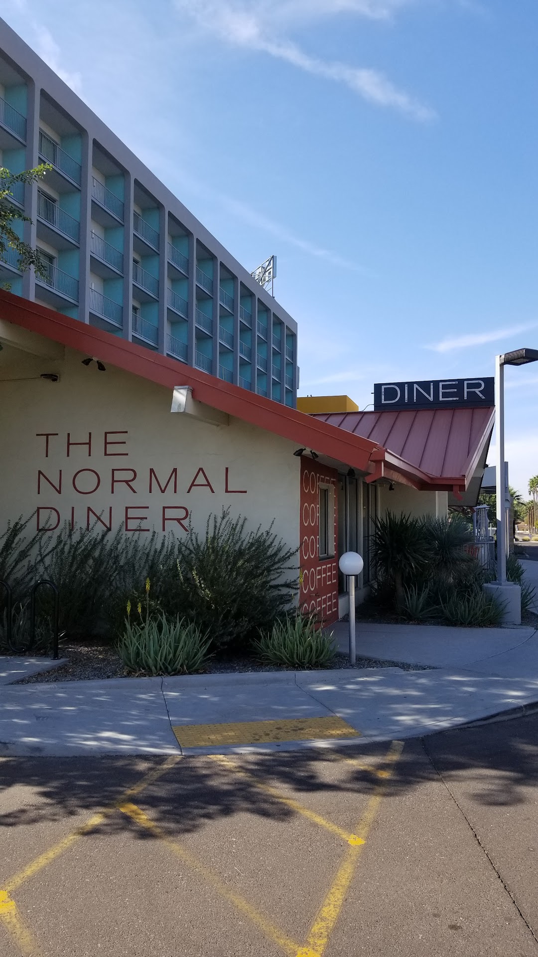 Last Wednesday we planned to grab a bite at The Normal before we saw a show at the Gammage. It was our first time there. We went to what looked like the restaurant, but were confused by a sign in the window that said "Closed". After investigation we discovered that the pub was opened, but in a different part of the hotel. The management needs to make the "closed" sign clearer for patrons who are not familiar with the lay out of the place. We didn't have reservations, but we were there early and were seated on the patio right away. It was great. From the beginning the staff was charming, personable and eager to please. We especially liked Kayla who, although was not yet a full-fledged server, was funny, helpful, and solicitous. Later Alex, the manager, stopped by all the tables near us and chatted with the patrons. He was interested in how folks were doing and was sincerely looking to be sure everyone was satisfied. We enjoyed the atmosphere and warm welcome we got. We all ordered drinks, both mixed and beer. The beer selection was adequate with a variety of draft and bottled beer. My friend and I both had mixed drinks they were good. I had a dark and stormy that was delicious. We didn't order apps. Three of us ordered burgers and one person ordered the Mac and cheese with crispy Brussel sprouts. For the price, the burgers were good. The meat patty wasn't huge, but we were fine with that. The fries were very much to the liking of three of us. They were the thin variety and VERY crispy. I loved them and although I never eat all the fries, I finished mine!!! My friend who prefers them softer wasn't as impressed. The Mac and cheese was mild in flavor and suitable to the person who ordered it. But the crispy Brussel sprouts were excellent!!!!! They came on top of the Mac and cheese and added crunch and pizazz to the mild flavor of the Mac and cheese. After our meal we got to sample the cheesecake. It was creamy, slightly lemony and the fruit topping was a perfect addition. We really loved sitting on the patio and watching the activity around us. The restaurant is across a busy intersection from the maroon parking lot at the Gammage, which is where we parked. It was a very easy walk. I would suggest more umbrellas for the tables as the sun is bright and at that time of day quite warm. The breeze was perfect! Overall, this restaurant is convenient to the Gammage, well managed, and staff is very friendly. The food is good for what it is. If you are looking for an elite, high-end eatery, you may want to look elsewhere, but if you are looking for a comfortable, reasonably priced pub atmosphere, you will most likely be happy with The Normal. We will go back and look forward to sampling other options...